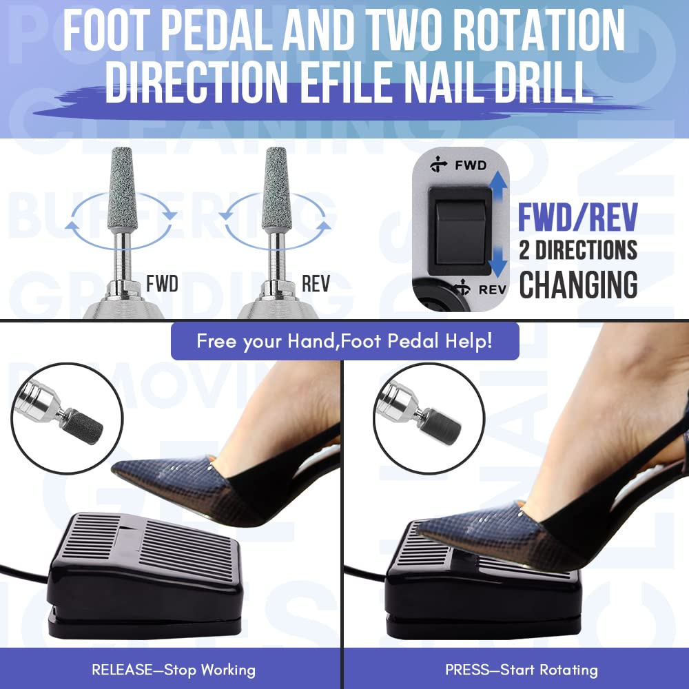 - Foot Pedal and Two Rotation Direction Efile Nail Drill: Two directions for left-hand and right-hand use. This nail files for acrylic nails is equipped with the F-Forward and R-Reverse buttons to change the direction of the rotating bit, which enables any right-handed or left-handed use. “Hand” mode and “Foot” mode for you to choose and better meet your requirement.