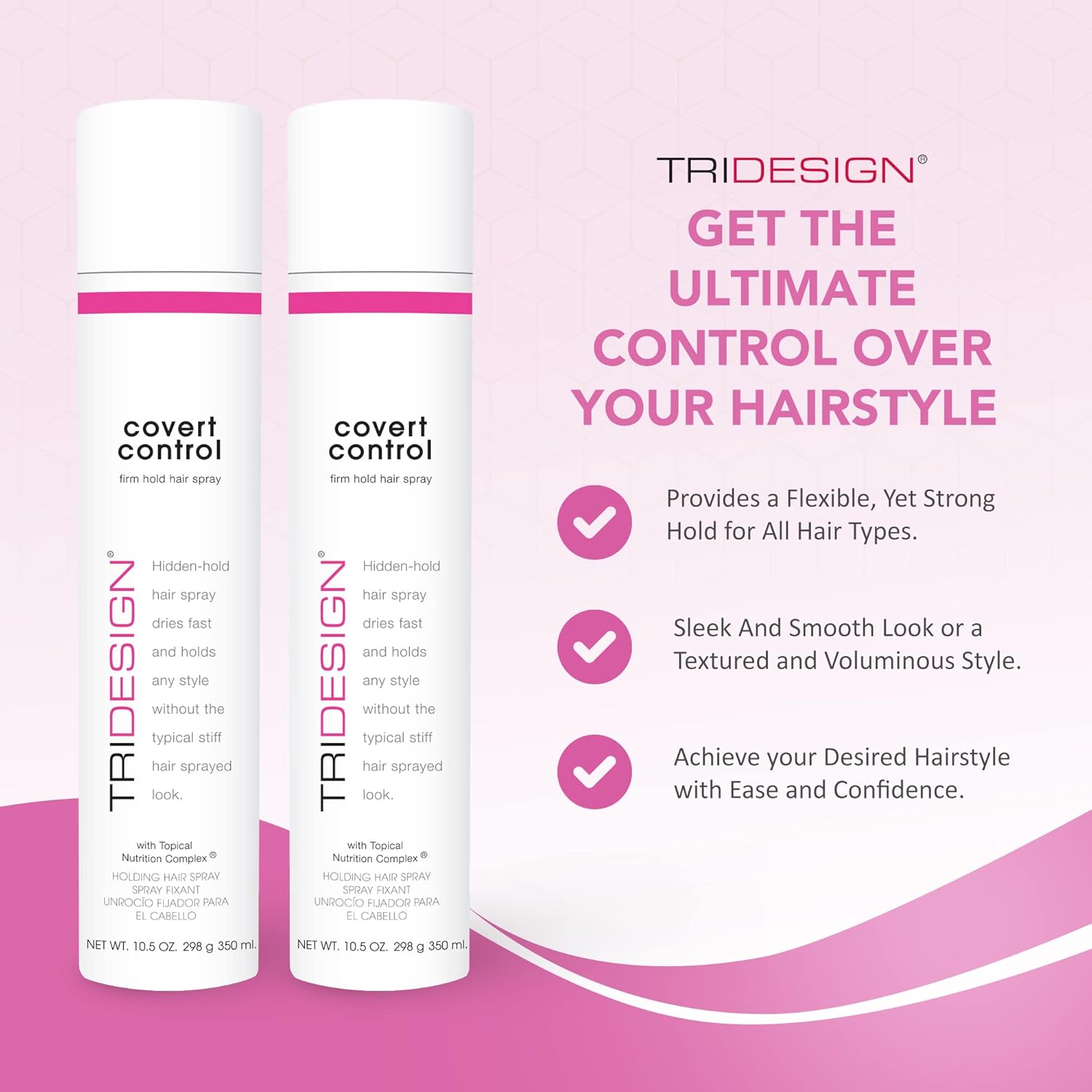 - INVISIBLE HOLD: TRI Design Covert Control offer a firm hold to any hairstyle without the usual stiff look. Apply on your hair and style any way you like for hair that looks soft and naturally smooth. With our hair spray, every hair fiber will be set in place without any visible layer of film.