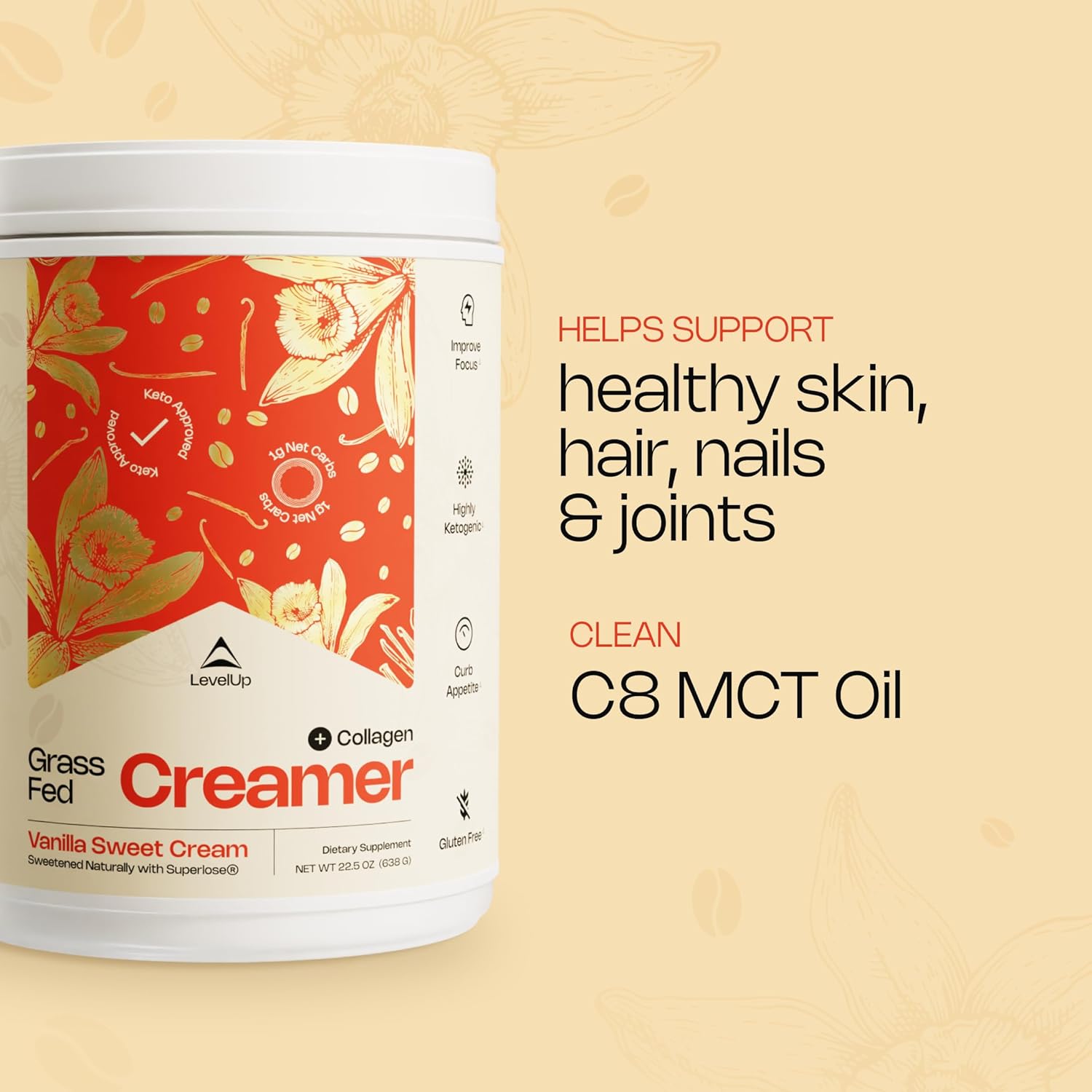 LevelUp Creamer, with Energizing MCT Oil and Collagen Peptides, Keto Coffee Creamer, Supports Natural Energy & Ketone Production - Vanilla Sweet Cream, 22.5 oz