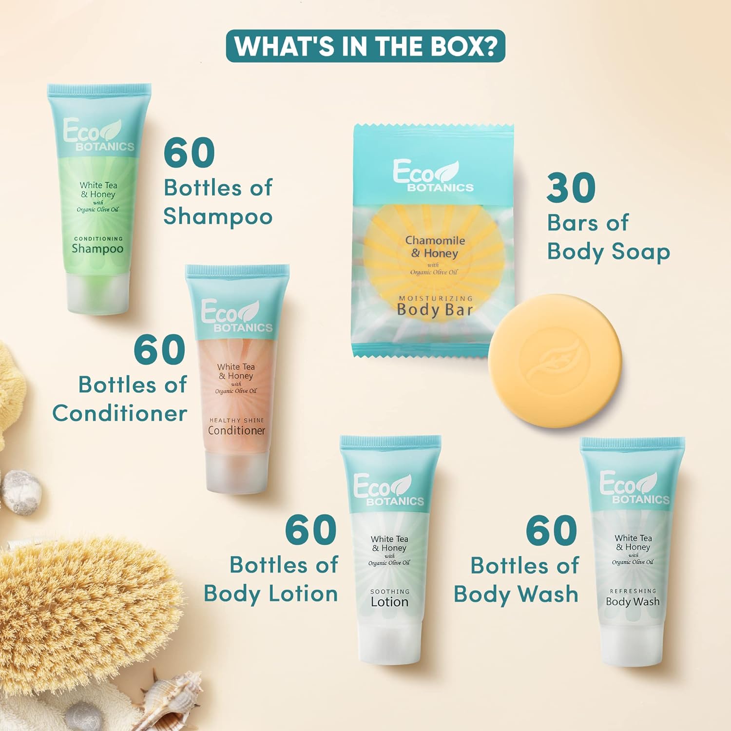 - IN THE BOX: This 300 piece mini toiletries set has everything you need to keep your guests comfortable. Your hotel kit includes 60 of each: Shampoo, Conditioner, Lotion, Body Wash & Soap Bar. Naturally scented with white tea, honey & chamomile for an invigorating & refreshing scent!