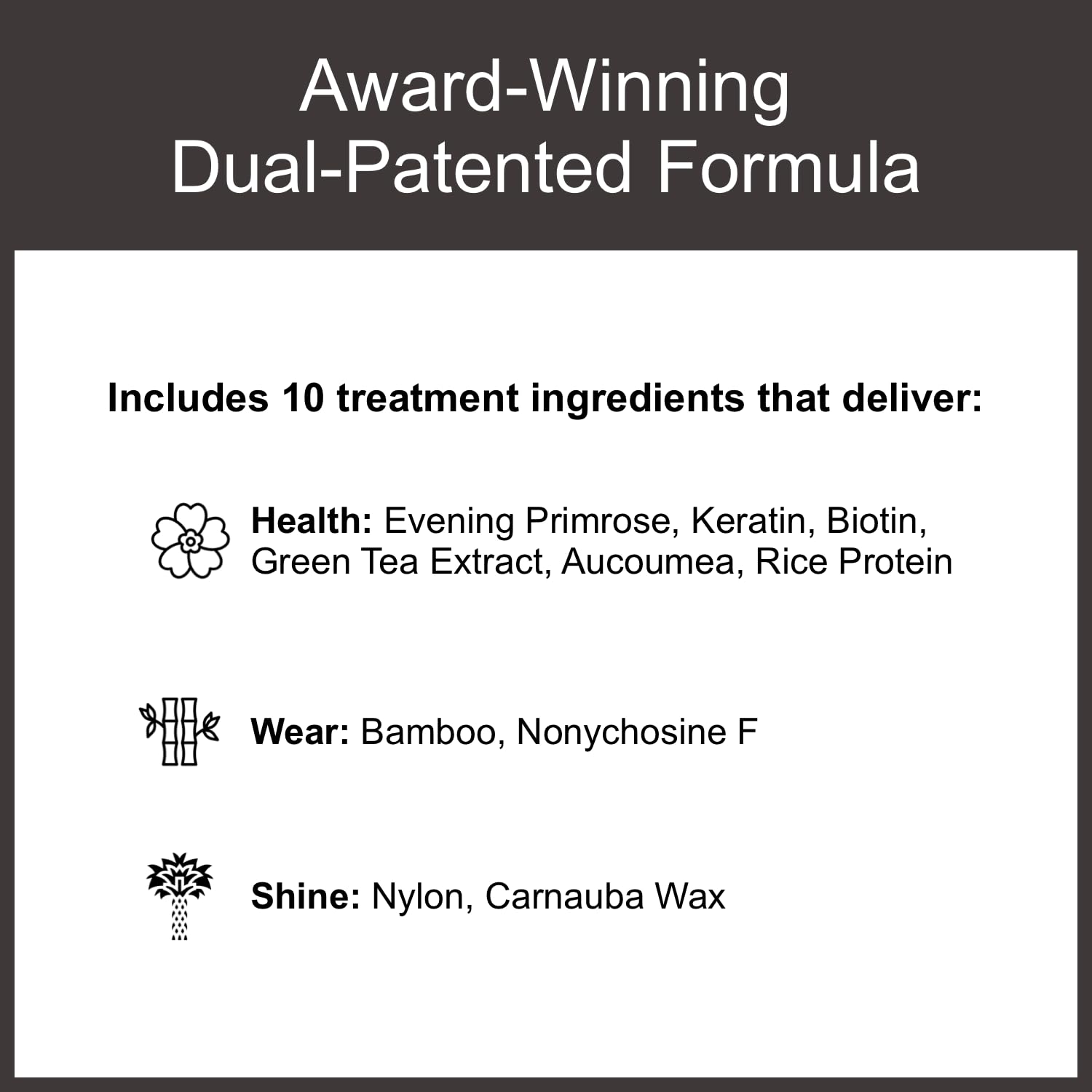 - TREATMENT ENRICHED FORMULA: This dual-patented nail polish formula delivers health, wear and shine with 10 exclusive ingredients to ensure optimum well-being and benefits for the nails. Requires no lamps or tools.