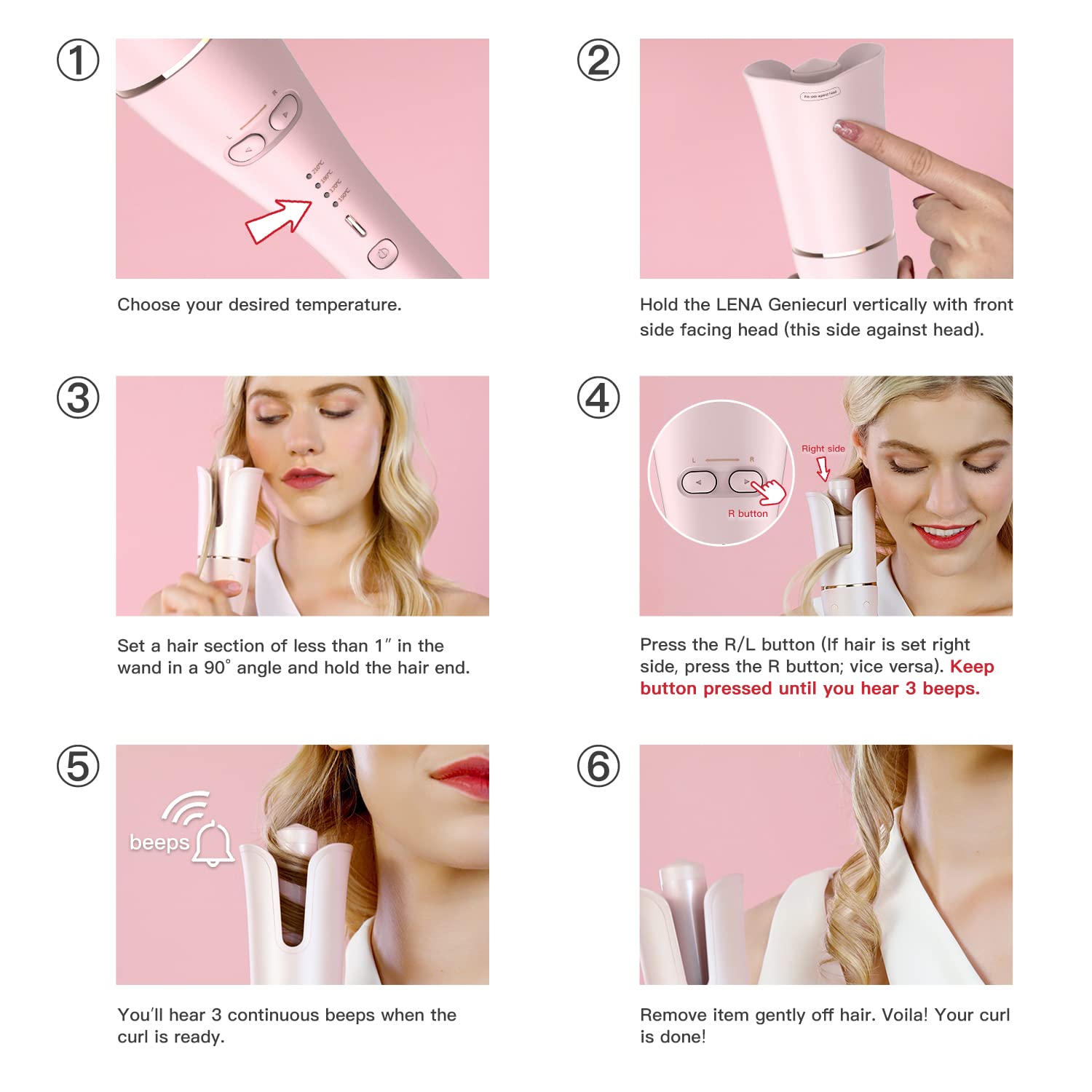 - 💓【EASY CURLER FOR LONG-LASTING RESULT】 Perfect curls in just 3 simple steps - 1. Set your hair in the wand; 2. Push the spin button; 3. Take your hair out after the beep. Complicated hair styling made simple and suitable for users of all ages with or without any experience. Follow instructions and enjoy your new look in minutes. NOTE: Use with hair without any hair protectant.