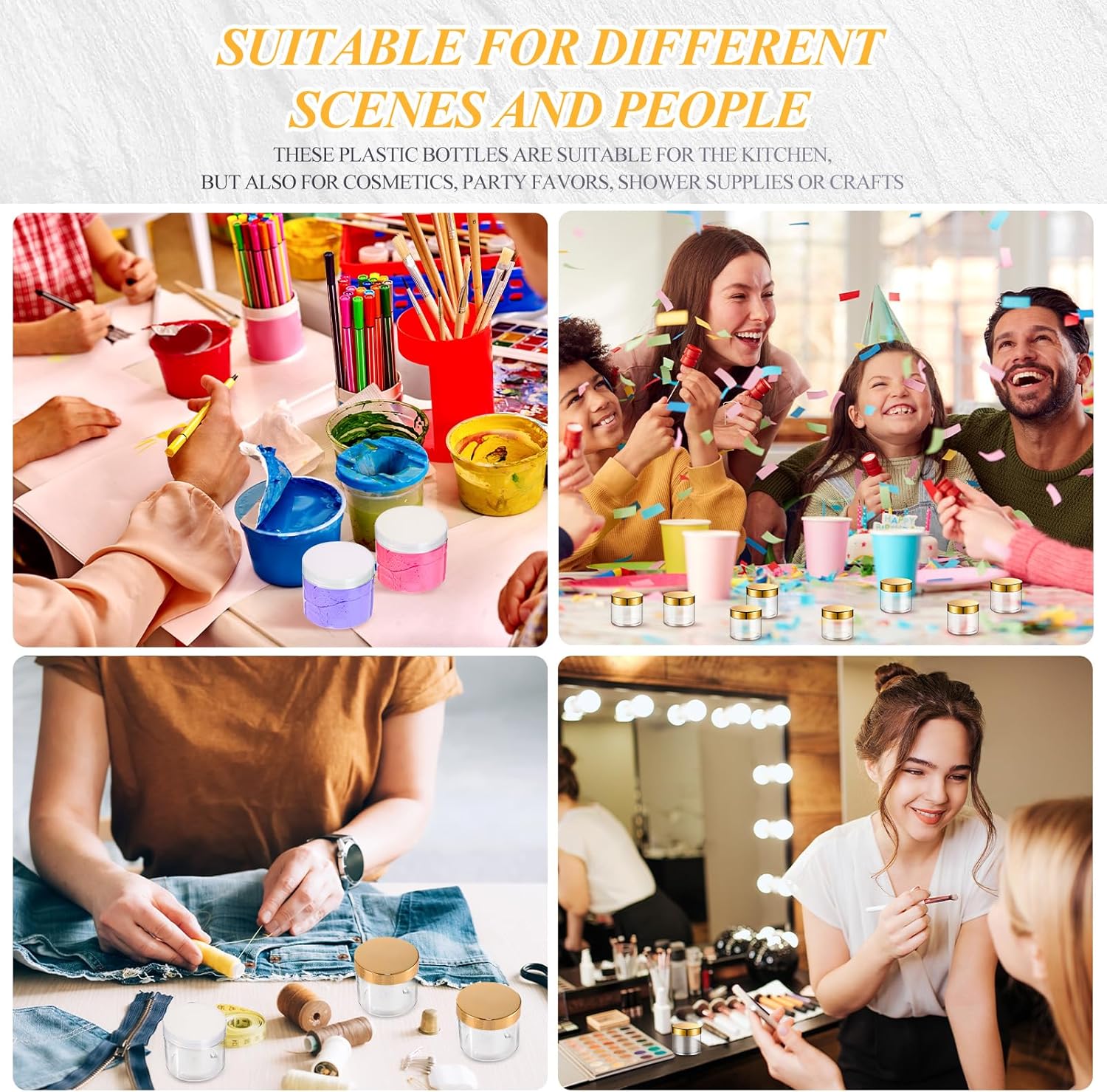 - Quality material: the 1 oz plastic jars with lids are made of quality clear plastic, without odd smell, does not contaminate your skincare products, stable, high temperature resistance, a gold plastic cover with lid, sealed storage and leak proof