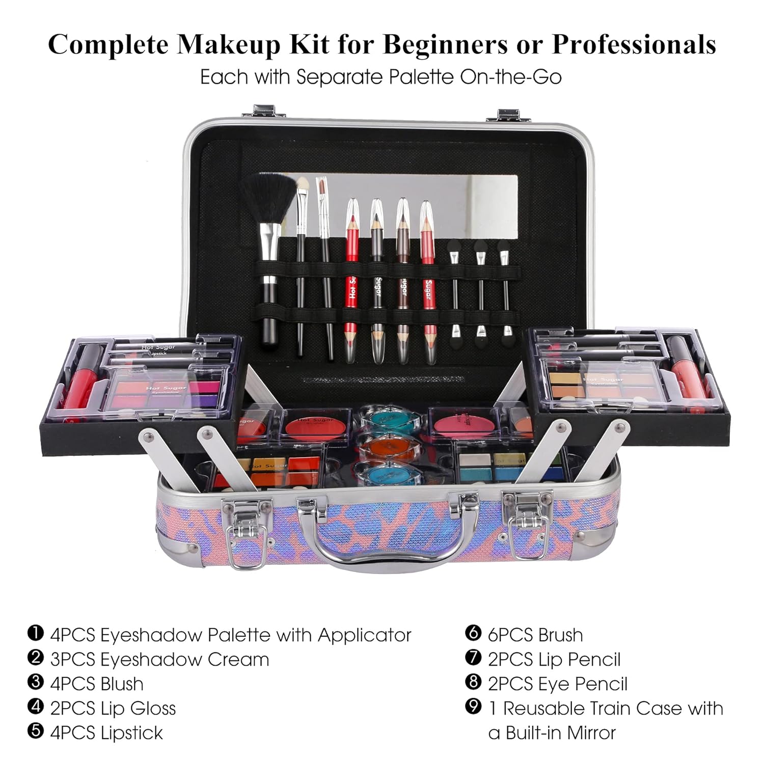 - What You Get: Makeup and applicators-27 eye shadows,4 blushes,2 lip glosses,4 lipsticks,10 brushes,2 lip pencils,2 eye pencils. A reusable train case with a built-in mirror-It looks fabulous with cute pink leopard leather and can be used to store your cosmetics, makeup tools, jewelry and watches.