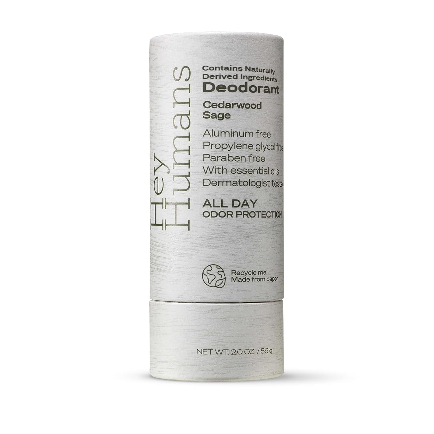 - Hey Humans deodorants for men and women are aluminum-free, paraben-free, phthalate-free, propylene glycol-free & silicone-free. They're also packaged in easily recyclabe paper for sustainability.