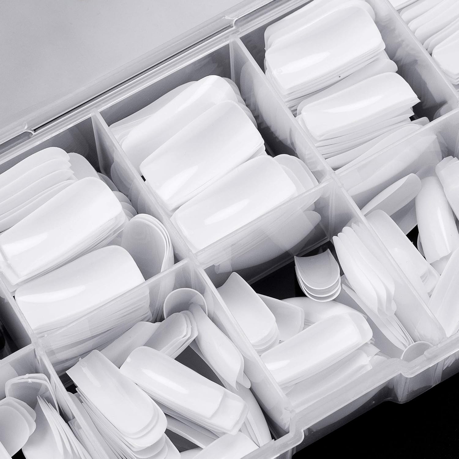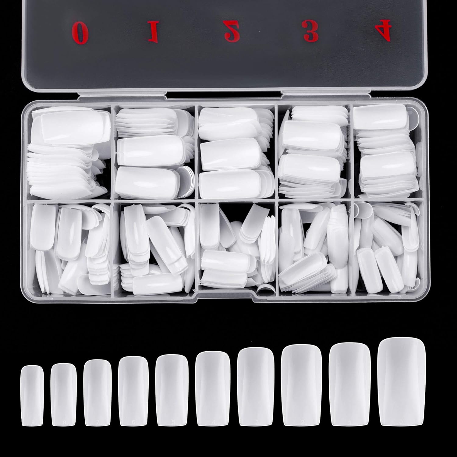 - Full-covered false nail tips, 500pcs nail tips, 10 different sizes, stored in numbered case with 10 small grid.