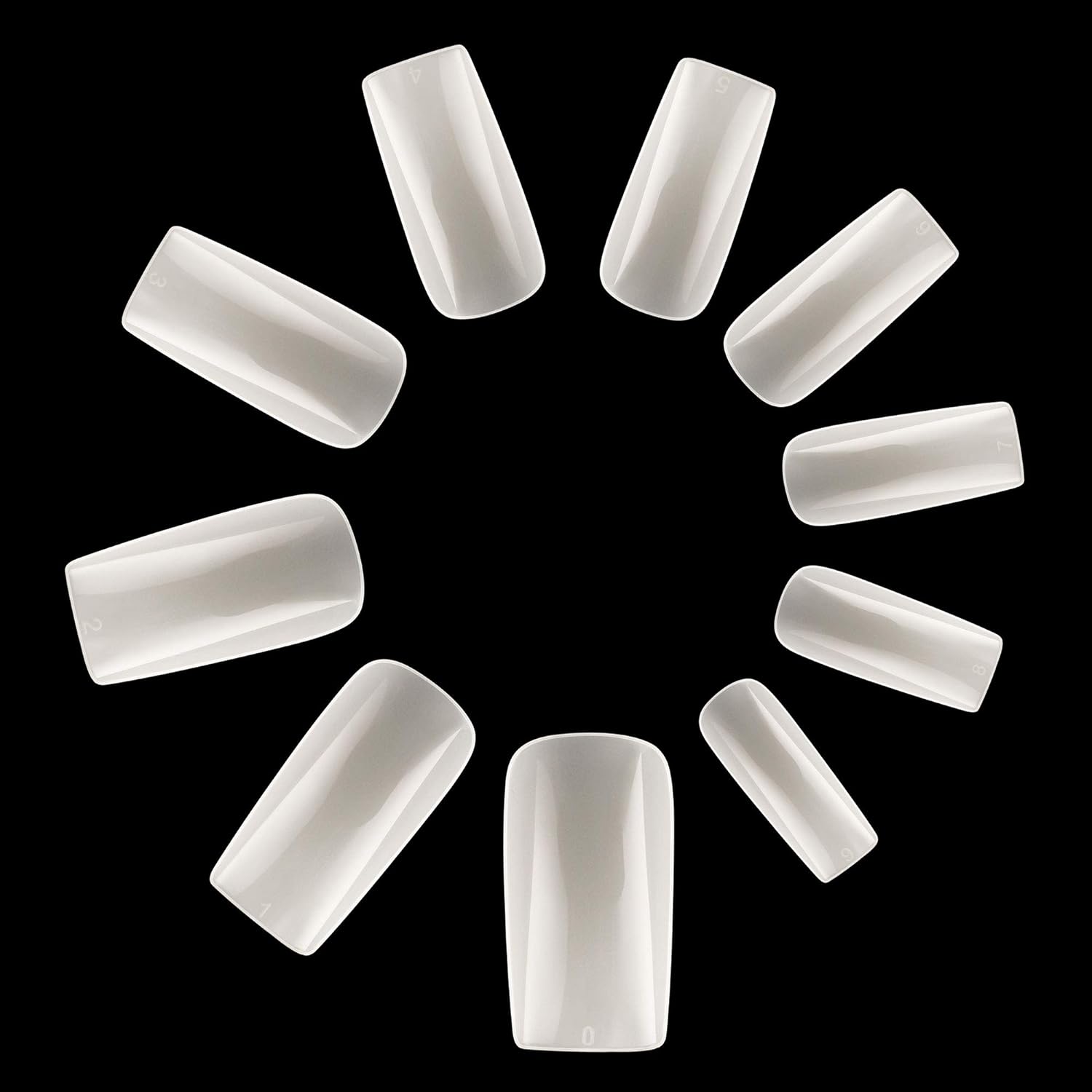- Full-covered false nail tips, 500pcs nail tips, 10 different sizes, stored in numbered case with 10 small grid.
