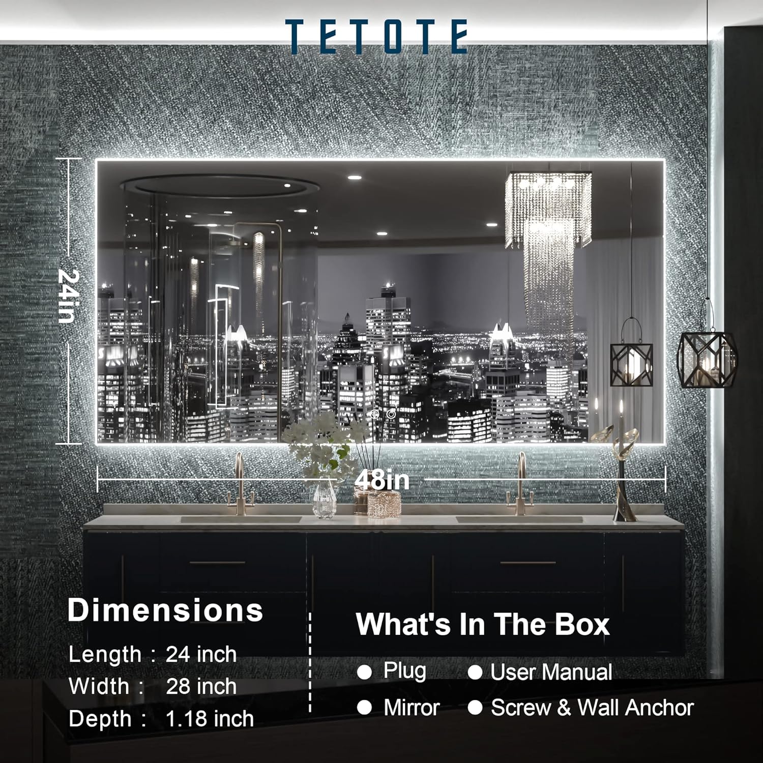 TETOTE 48 x 24 Inch LED Backlit Mirror Bathroom with Light,Anti-Fog,Dimmable,CRI90+,Makeup Vanity Mirror,Lighted Mirror(Horizontal/Vertical)