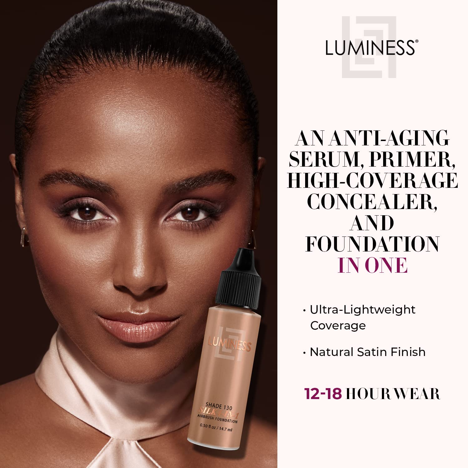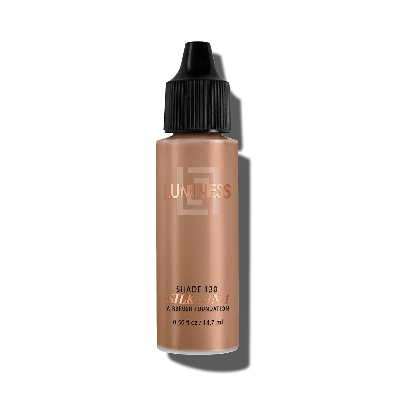 - Lightweight Coverage with a Natural Satin Finish: LUMINESS SILK 4-in-1 Airbrush Foundation combines an anti-aging serum, primer, high-coverage concealer, and all-day foundation into one. Provides 12-18 hours of water-resistant wear. 0.5-oz bottle in Shade 130.