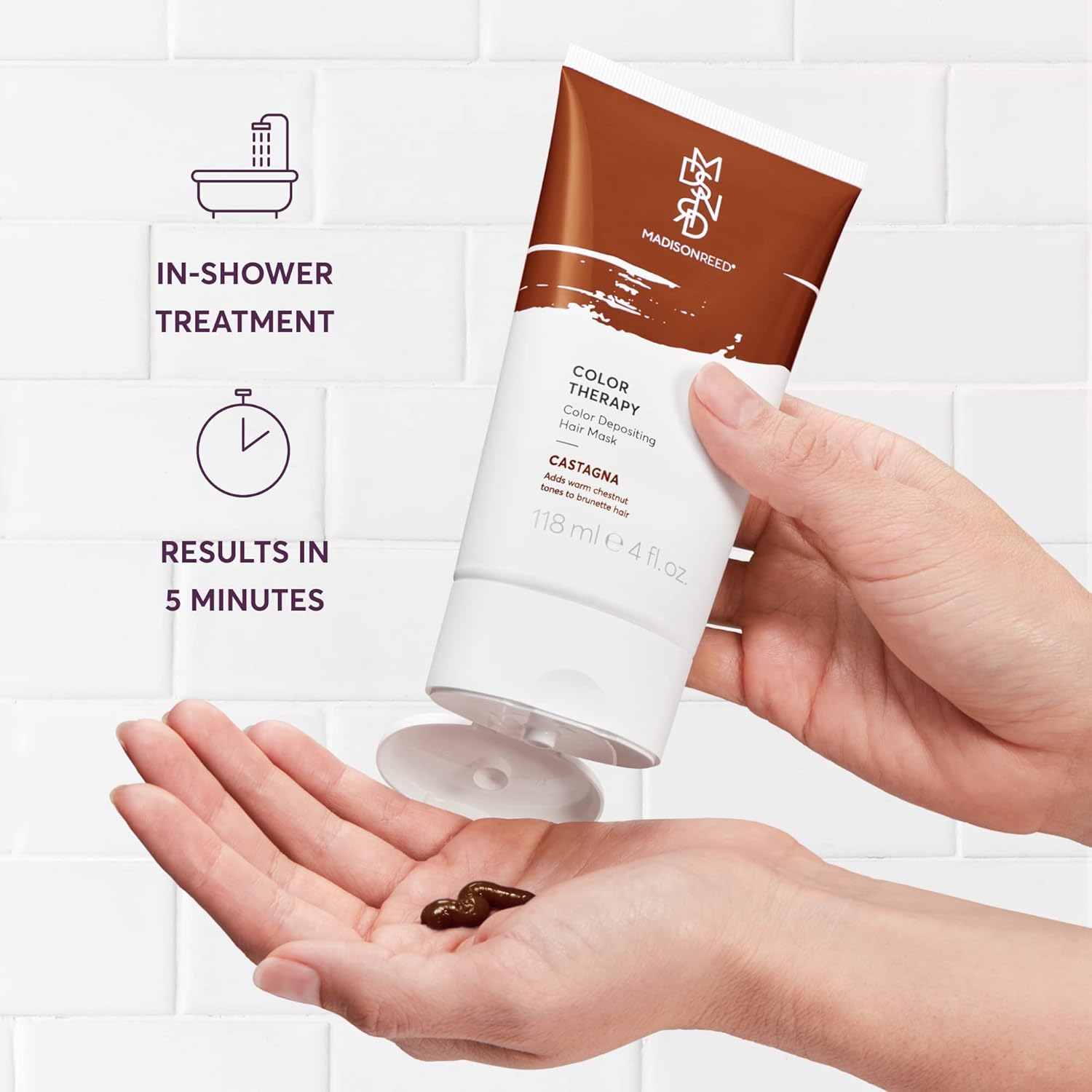 - COLOR DEPOSITING HAIR MASK: Madison Reed Color Therapy in Castagna works best on brunette or auburn hair, and adds warm bronze chestnut tones to refresh & enhance color. Not intended for gray coverage.