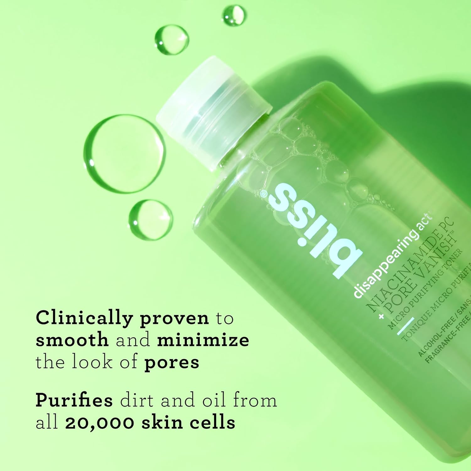 - DISAPPEARING ACT NIACINAMIDE TONER: Use Bliss' fragrance-free facial toner to instantly minimize the look of pores while leaving skin purified and refreshed