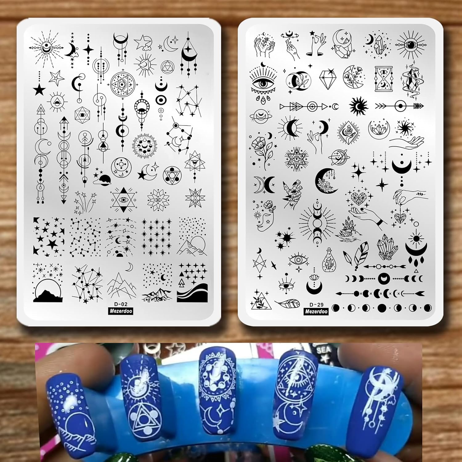 Starry Star Moon Design Stamping Plates Nail Art Kit 2pcs Galaxy Night Sky Large Nail Stamp Plates Templates Space Planet Nail Stamper Plate Heart Sun Geometry Printing Stencils Reusable Tools