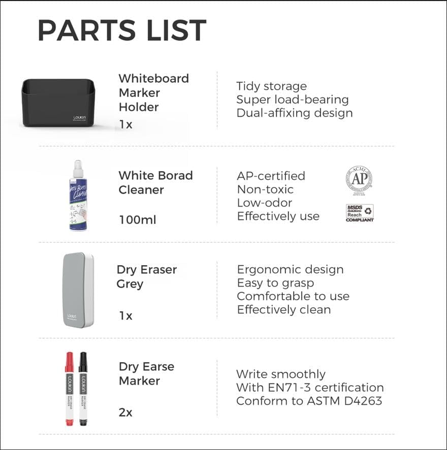 - CONTAINS: 1 marker holder(5.12 x 1.97 x 3.54 in) ; 1Dry eraser grey; 2 dry erase markers with En713 certification; 3.4 oz cleaner with AP certification;2x longlasting adhesive, 2x strong magnet.