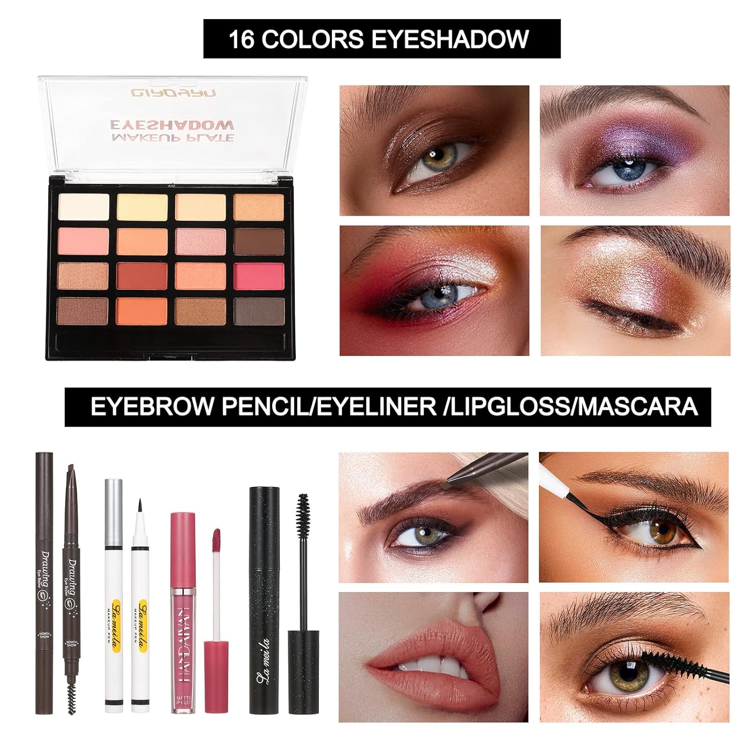 - 【Makeup Kit Includes】16 Colors Eyeshadow Palette, Liquid Foundation, Lip Gloss, Contouring Stick, Waterproof Eyeliner Pencils, Eyebrow Pencils, Mascara, Powder Puff, 7Pcs Makeup Brushes