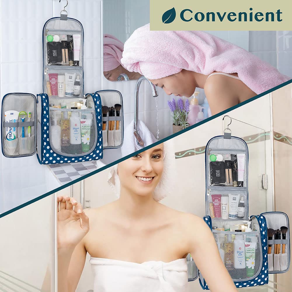 - COSMETICS TRAVEL BAG ORGANIZER: This toiletry bag for women has a hanging hook and multiple pockets that help you stay organizer during business trip, vacation travel. The hanging hook makes it easy to hang the toiletry bag to bars in the hotel shower bathroom. Unzip your toiletry bag to reveal compartments to organize your shampoo, skincare face hygiene products. This toiletry travel bag is an essential accessory for cruise in Europe, plane, Hawaii Trip, and honeymoon.