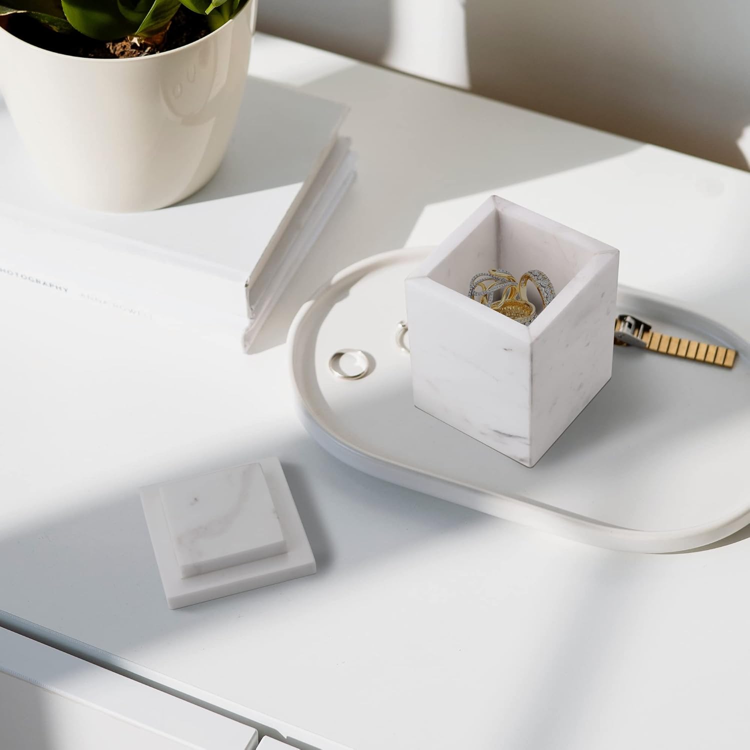 WORHE Marble Canister Natural Stone Qtip Holder with Lid Square Bathroom Vanity Organizer for Makeup Sponge Coffee Bean Dispenser Storage Jar Case for Home Decor White (DLW201)
