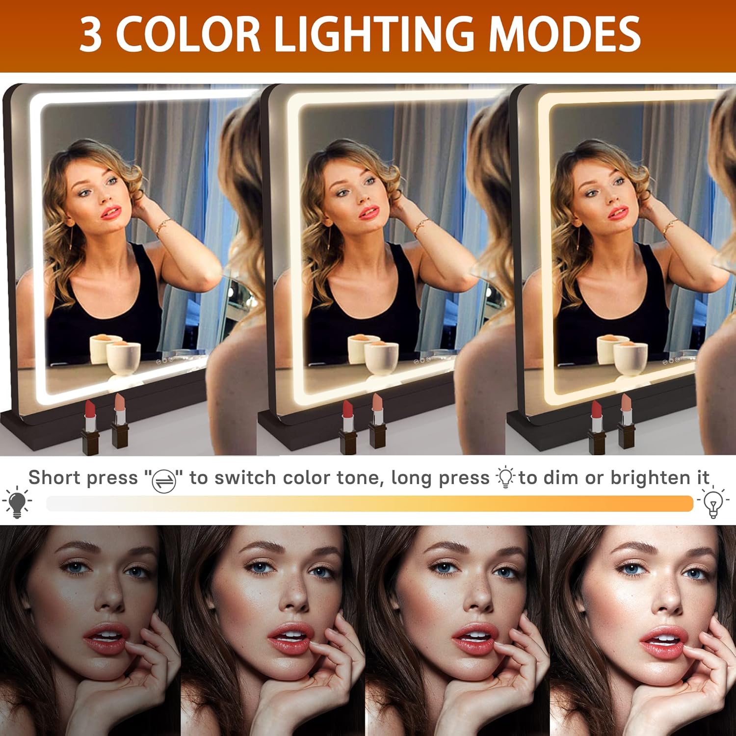 - 👍【Brightness Adjustable and 3 Color Lighting Modes】HASIPU lighted makeup mirror surrounded by 50,000 hours life Max 6000 Lumens high brightness LED Light Strip, with warm /natural /cold white three-tone settings, adjustable brightness 0%-100% can meet your personal makeup requirement.