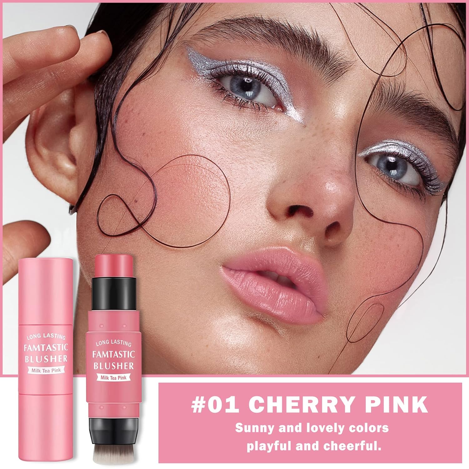 Cream Blush Stick with Brush,Waterproof Blush Makeup,Long Lasting 3 In 1 Cheek Blush & Lip Tint & Eye Shadow Makeup Stick,Easy To Use Blends Effortlessly,Cream Blush Makeup for All Skin Tones - Cherry Pink
