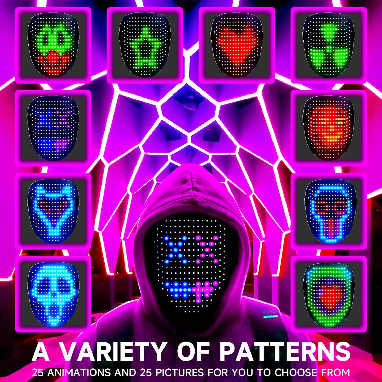 - Fun Technology Mask: Equipped with 234 high-lumen lamp beads and 3535 RGB LED lamp beads, our LED mask provides vibrant and eye-catching illumination. USB TYPE-C charging ensures 8-10 hours of continuous use after a 3-4 hour charge.