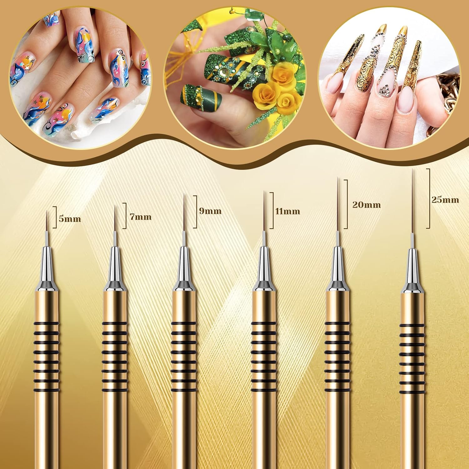 Nail Art Liner Brushes Set, 6Pcs Nail Art Design Brush Striping Thin Long Lines Dotting Drawing Pen, UV Gel Polish Painting Metal Handle Striper Brushes Size 5/7/9/11/20/25mm
