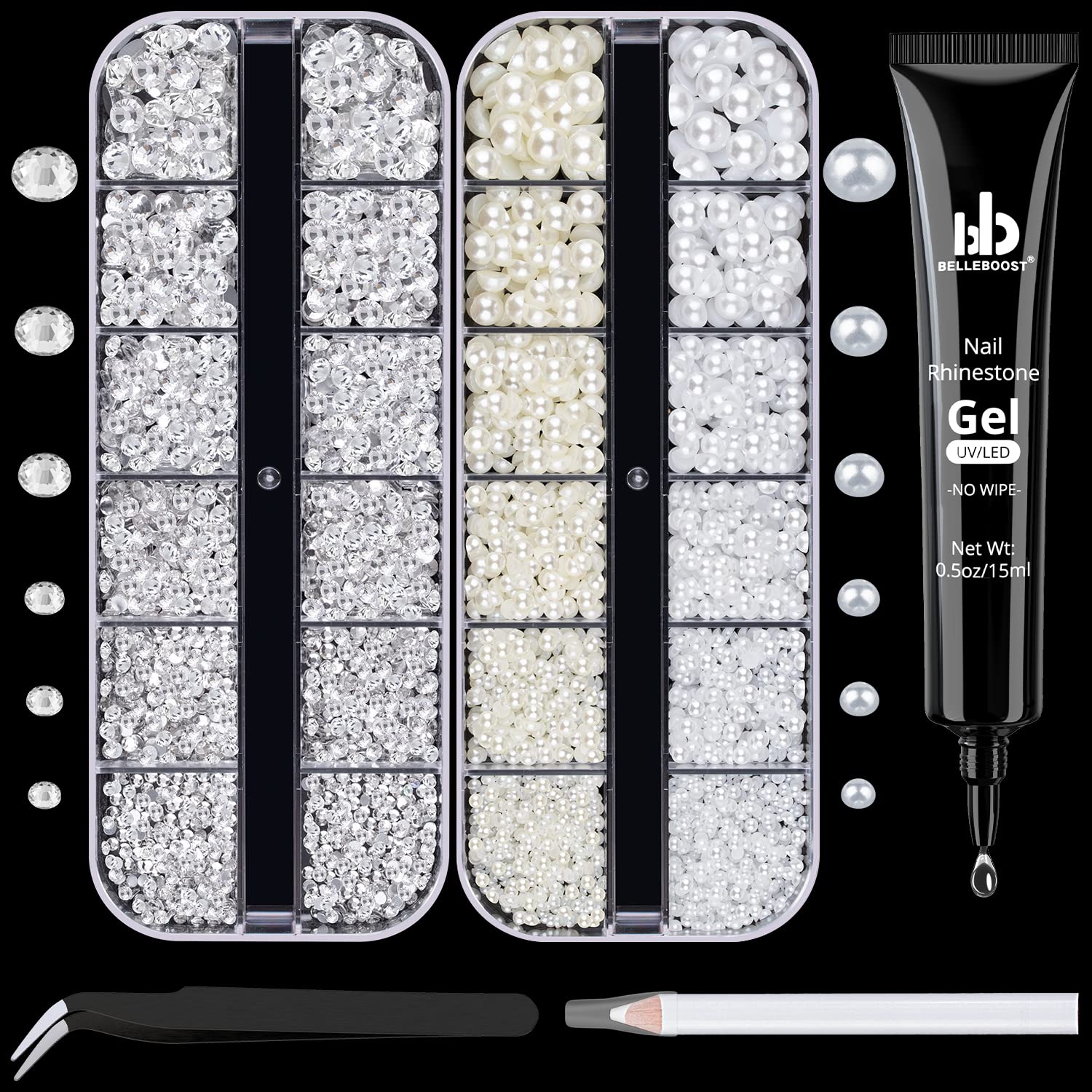 - 💎WHAT YOU WILL RECEIVE: This package contains 1 pc of 15ml tube design NO WIPE rhinestone gel glue; 1 box of flat back round glass crystal transparent white rhinestones; 1 box of white&beige half round pearls; 1 pc of picker pencil and 1 pc of tweezer. This set helps you decorate your nails more conveniently.