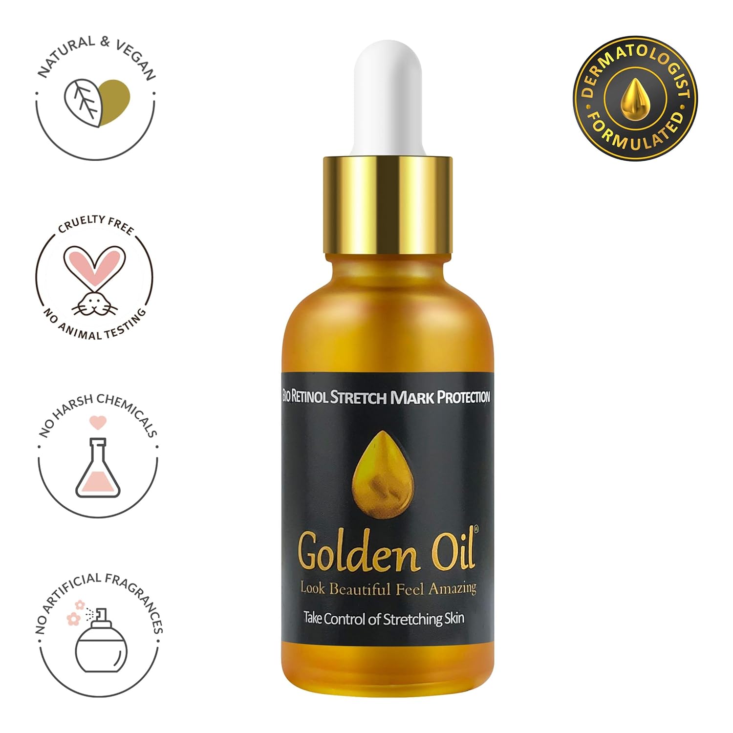 - POWERFUL NATURAL INGREDIENTS: Golden Oil Bio Retinol Stretch Mark Protection is specially formulated with Bakuchiol and essential vitamins A, B, C, E, Beta-Carotene and Essential Fatty Acids Omega 3, 6 and 9 to penetrate and rejuvenate the skin and help keep skin keep supple and soft.