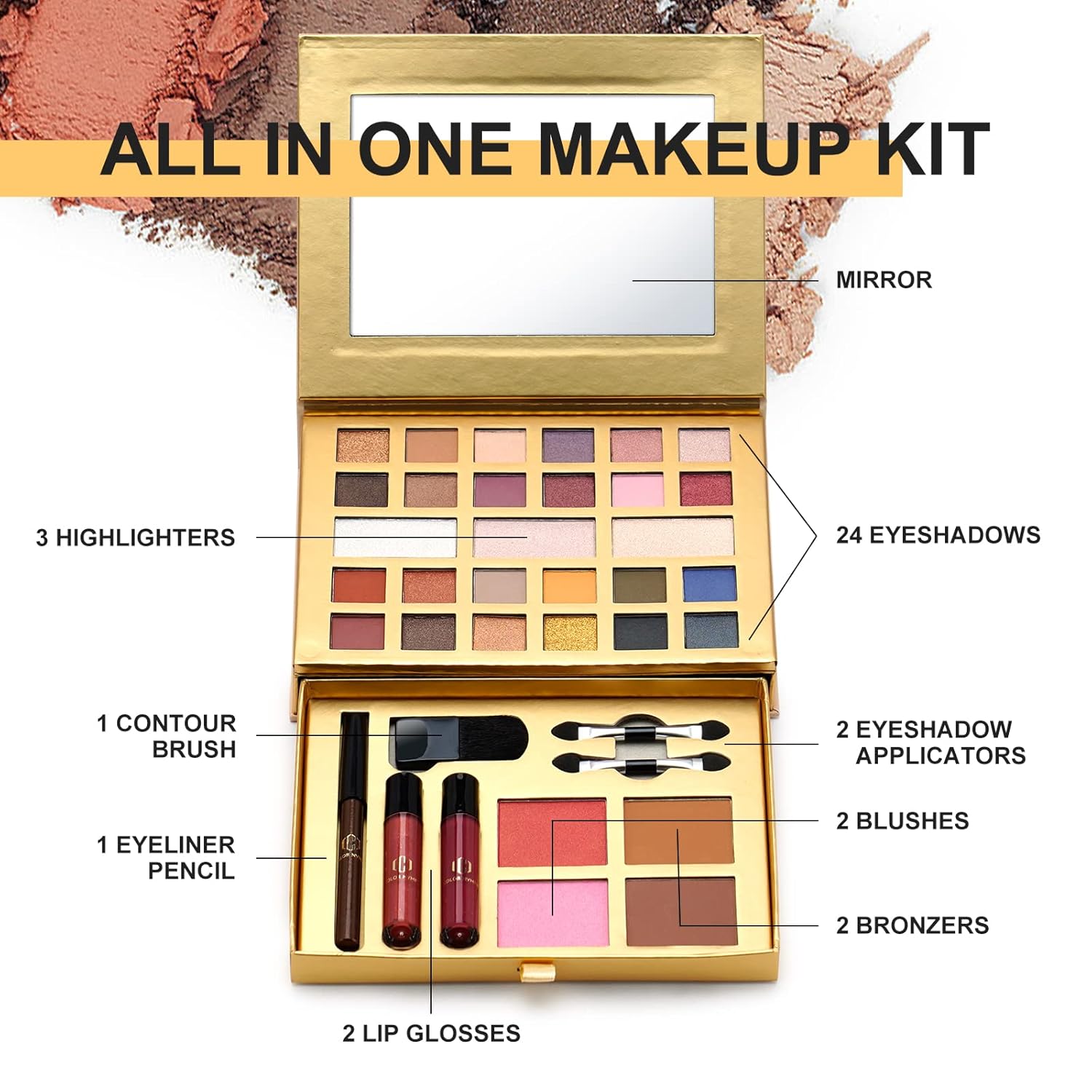 - [All in One Makeup Kit] This compact makeup kit includes 24 eyeshadows, 3 highlighters, 2 blushes, 2 bronzers, 2 lip glosses, a brown eyeliner pencil, a contouring brush, 2 dual-sided applicators and a mirror, which covers full face makeup.