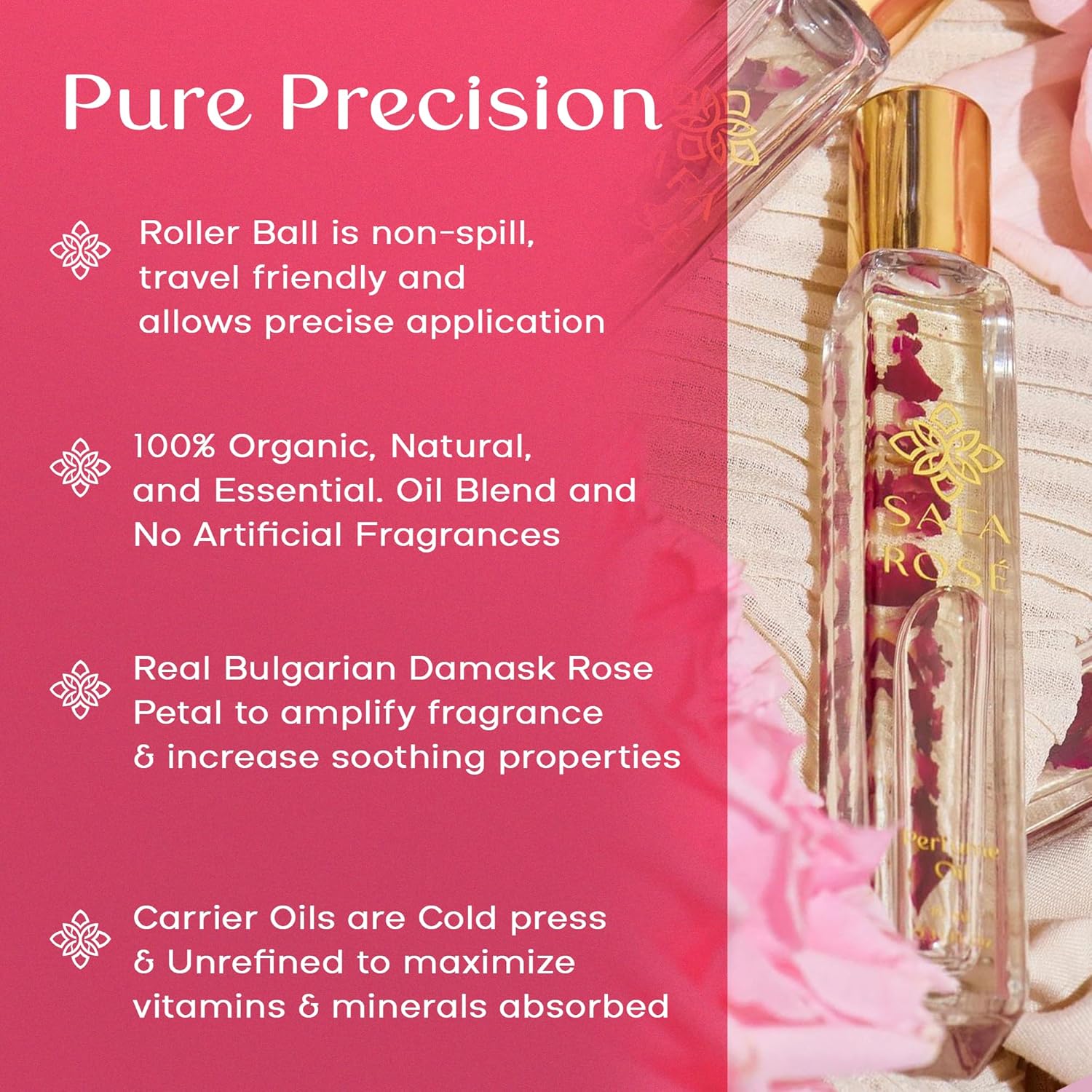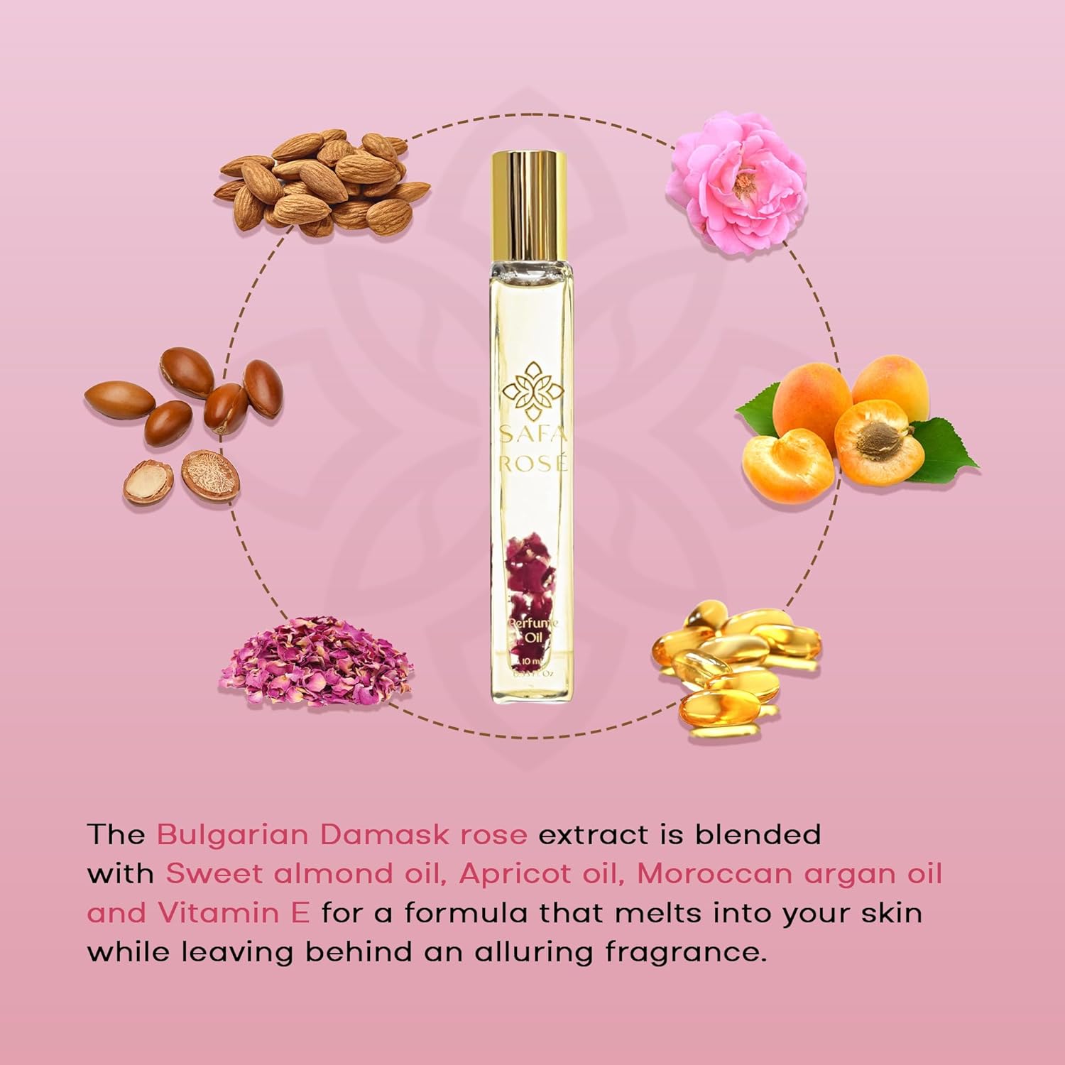 - LIQUID GOLD: SAFA Rosé Roller Oil is an organic blend of Bulgarian Damask essential oil and cold-pressed, unrefined carrier oils to retain maximum benefits. Dried USDA organic Indian Rose petals are infused within the oil, and the aroma of the highly coveted Bulgarian Rose promotes energy and vitality, soothes the mind and uplifts the mood. This fragrance oil is packed in a roller bottle for a convenient, travel-friendly, and intimate fragrance experience that is personalized for you.