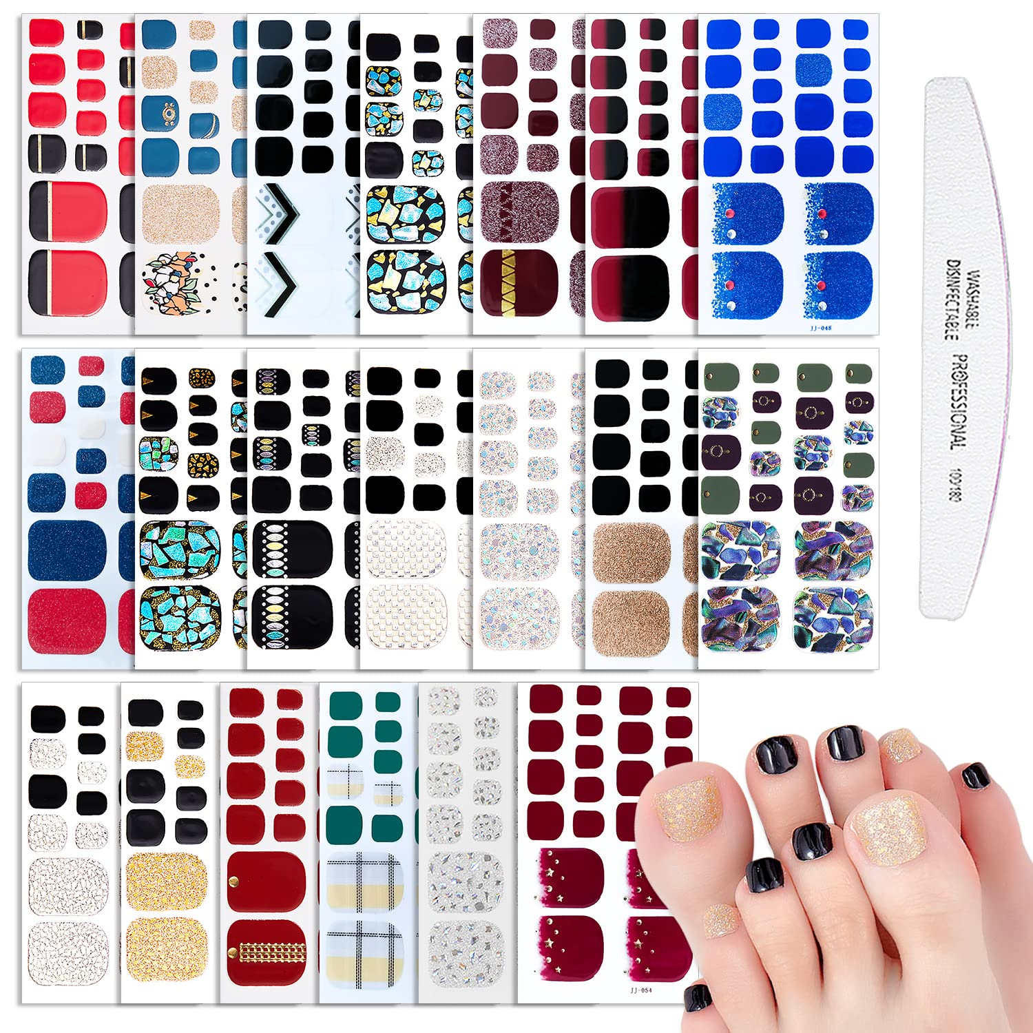 - 【GORGEOUS GLITTER DESIGN】:The toe nail wraps are with multiple colorful glitter designs, indlude shell flake, marble, gold and silver glitter designs, etc., Satisfy your rich imagination of nail DIY and create your own nail style !