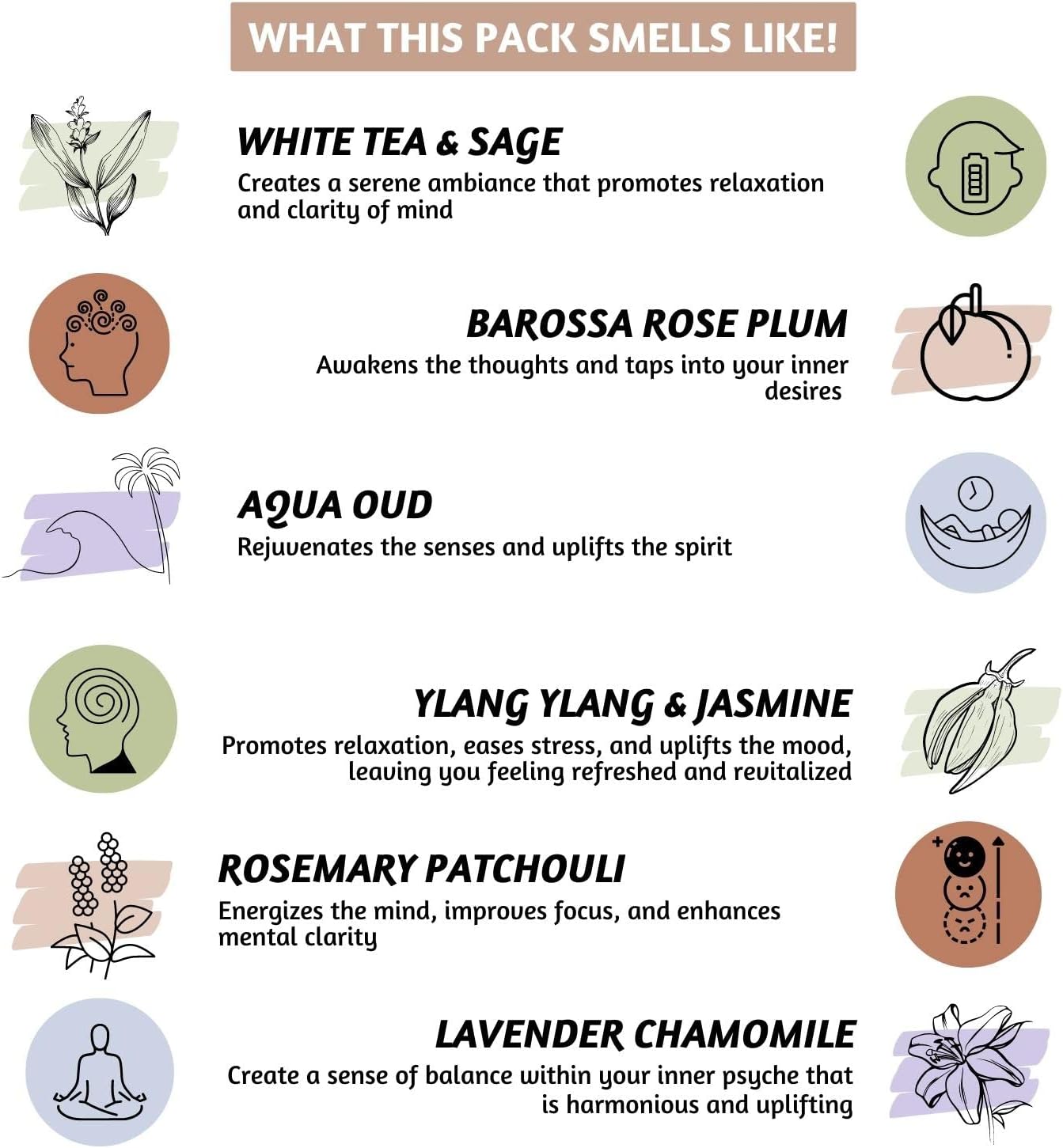 - [Fragrance Note] - These incent feature a beautiful blend of woody and musky fragrances like white tea & sage, rose plum, aqua oud, ylang ylang & jasmine, patchouli, and lavender. The calming effect of cone incense scents can promote emotional balance, uplift your mood, and nourish your spirit.