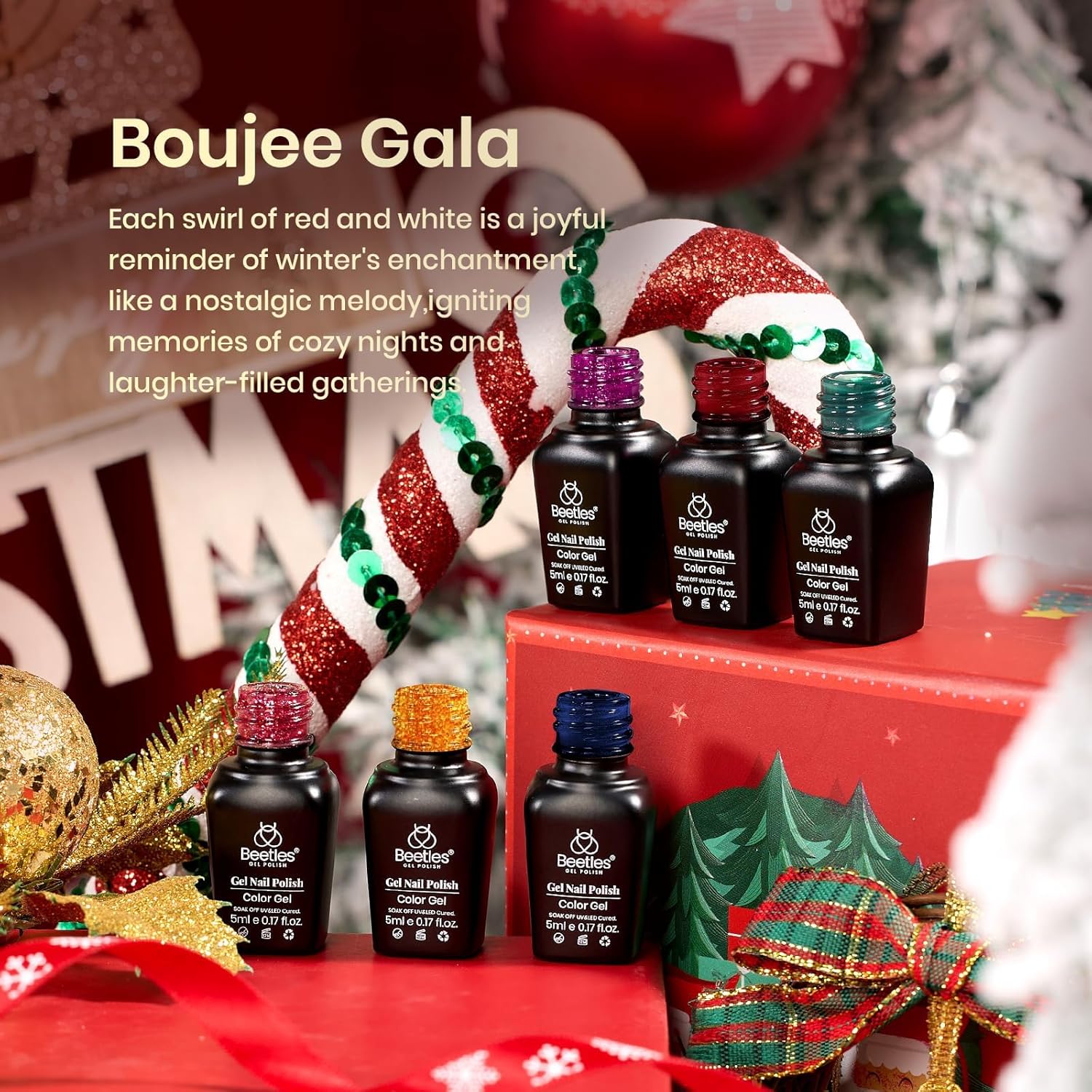 - Beetles Gel Nail Polish Set: A beautiful range for Winter. Beneath the night sky, a lush garden comes alive, as an endless red carpet leads to a resplendent banquet hall adorned with priceless jewels. Package Include:6 colors gel polish colors of 0.25 fl.oz (7.5ml) each. Boujee Gala collection can make you feel the luxury of banquet at home!