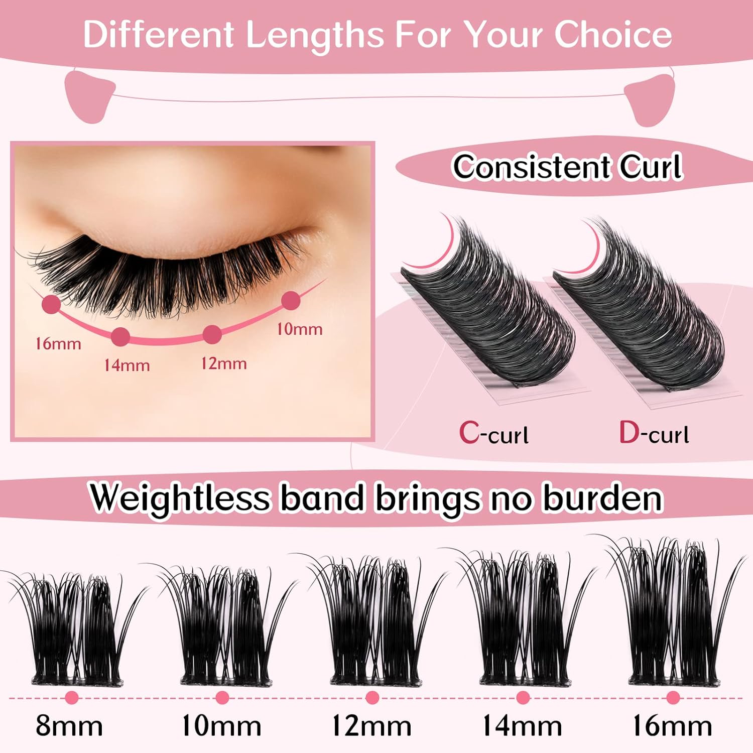 - Comforatable & Reusable: Our brand eyelash clusters have super thin band and they are very lightweight. Comfortable to wear the whole day and whole night. Individual cluster lashes can be reused up to 5 times if they are nice cared.