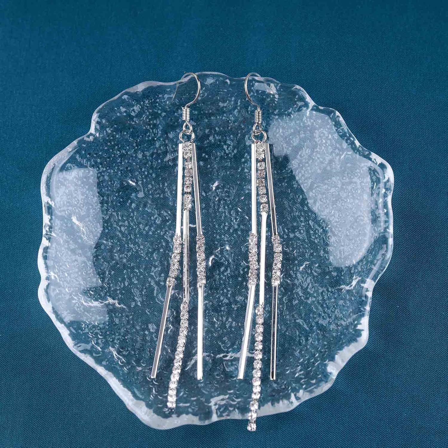 - Long rhinestone tassel earrings.Item Details:Handmade Item.Size:As Shown.Color:Silver.Materials:Quality Alloy/Crystal.Location:Ear.Style:Boho/Vintage.