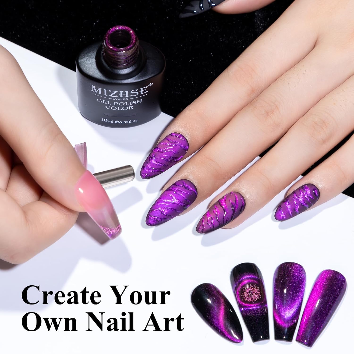 - MIZHSE 9D Cat Eye Gel Nail Polish: 1 color magnetic gel polish, 1 magnet stick, without black base. Save your money and time to nail salon! Enjoy the DIY fun of nail beauty at home. Suitable for natural nails, false nails, acrylic nails, etc.