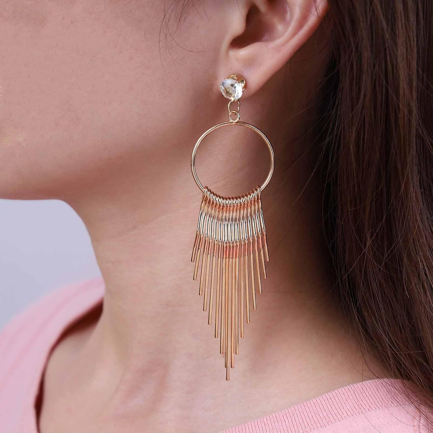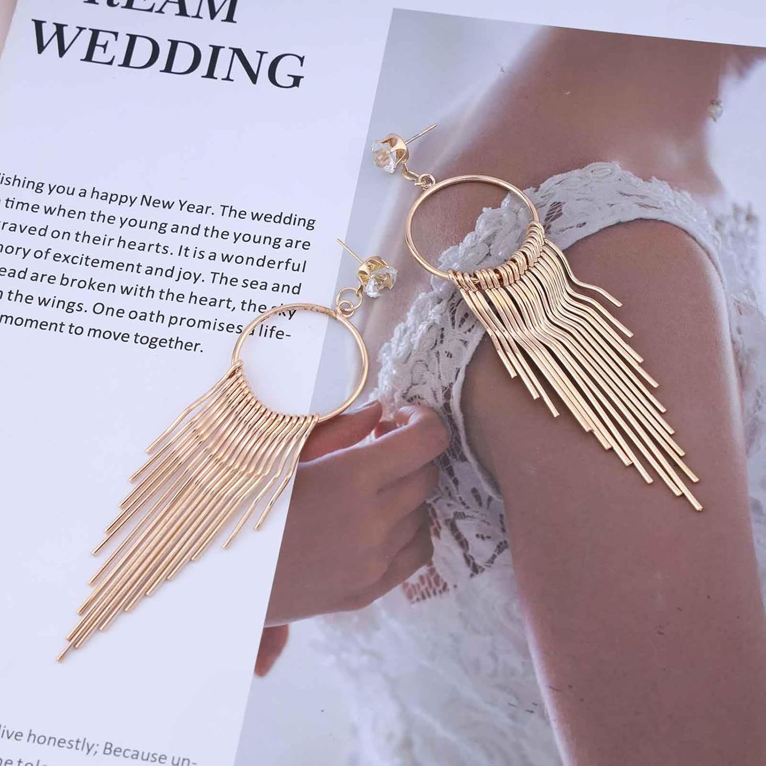 - Gold tassel dangle earrings.Item Details:Handmade Item.Size:As Shown.Color:Gold.Materials:Quality Alloy/Crystal.Location:Ear.Style:Boho/Vintage.