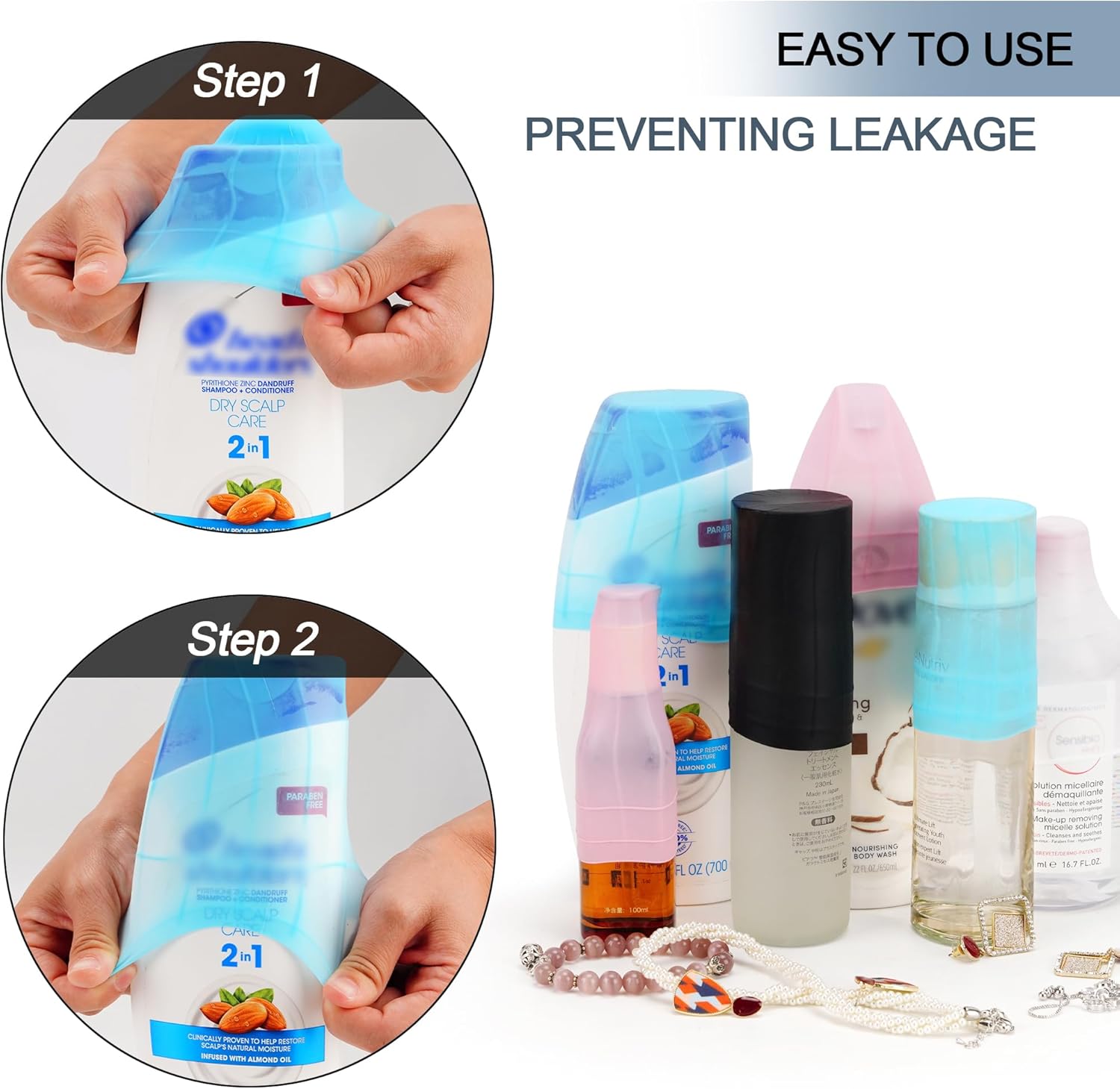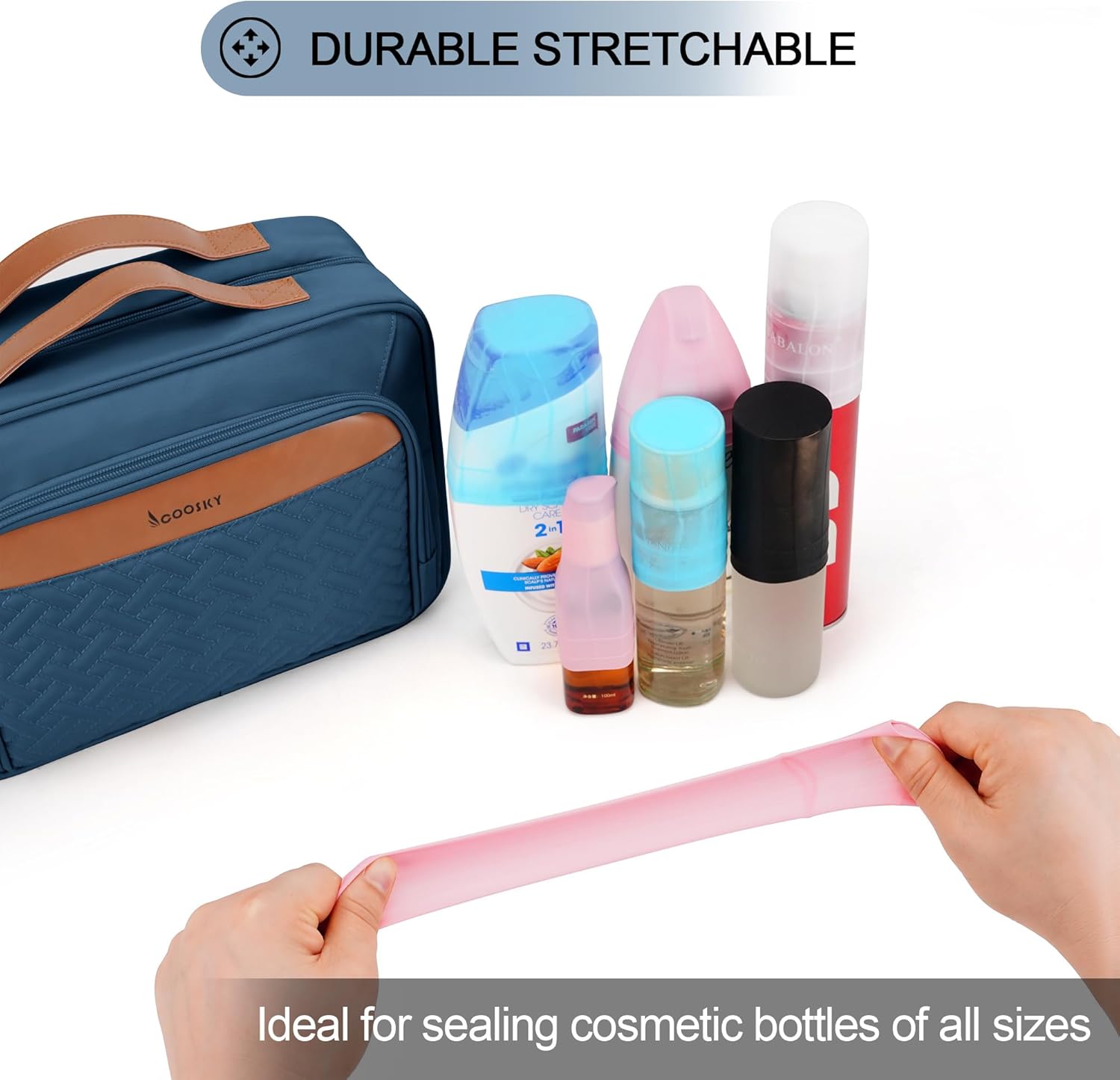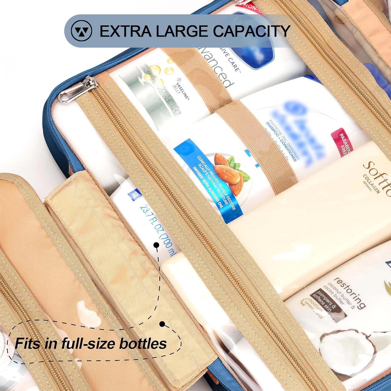 Travel Hanging Toiletry Bag for Women, Large Makeup Bag 8 Leak Proofing Silicone Bottle Covers, Waterproof Cosmetic Bag with Jewelry Organizer Compartment, Toiletries Kit Set, Navy Blue