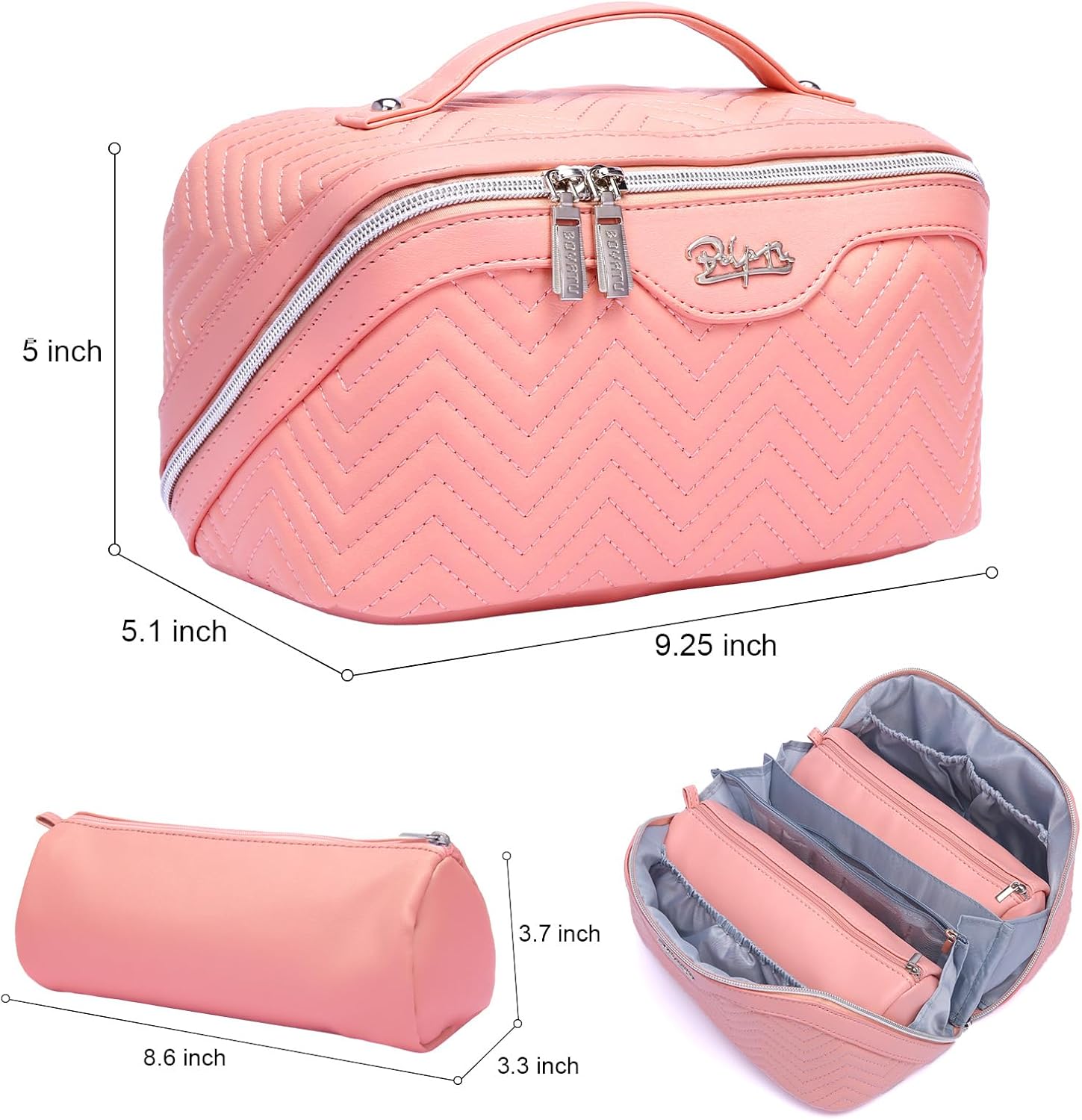 - Large Capacity Cosmetic Travel Bag: This makeup bag organizer, features a portable zipper opening. Measuring 9.25*5.1*5 inches in size, fit for 230ml toner or even larger bottles.What's more, It is a lightweight makeup bag with large capacity,just weight 0.75 LB. It is easy to hold your cosmetics and toiletries, can be used as a travel toiletry bag, preppy makeup bag, bathroom bag, cosmetic case, etc.