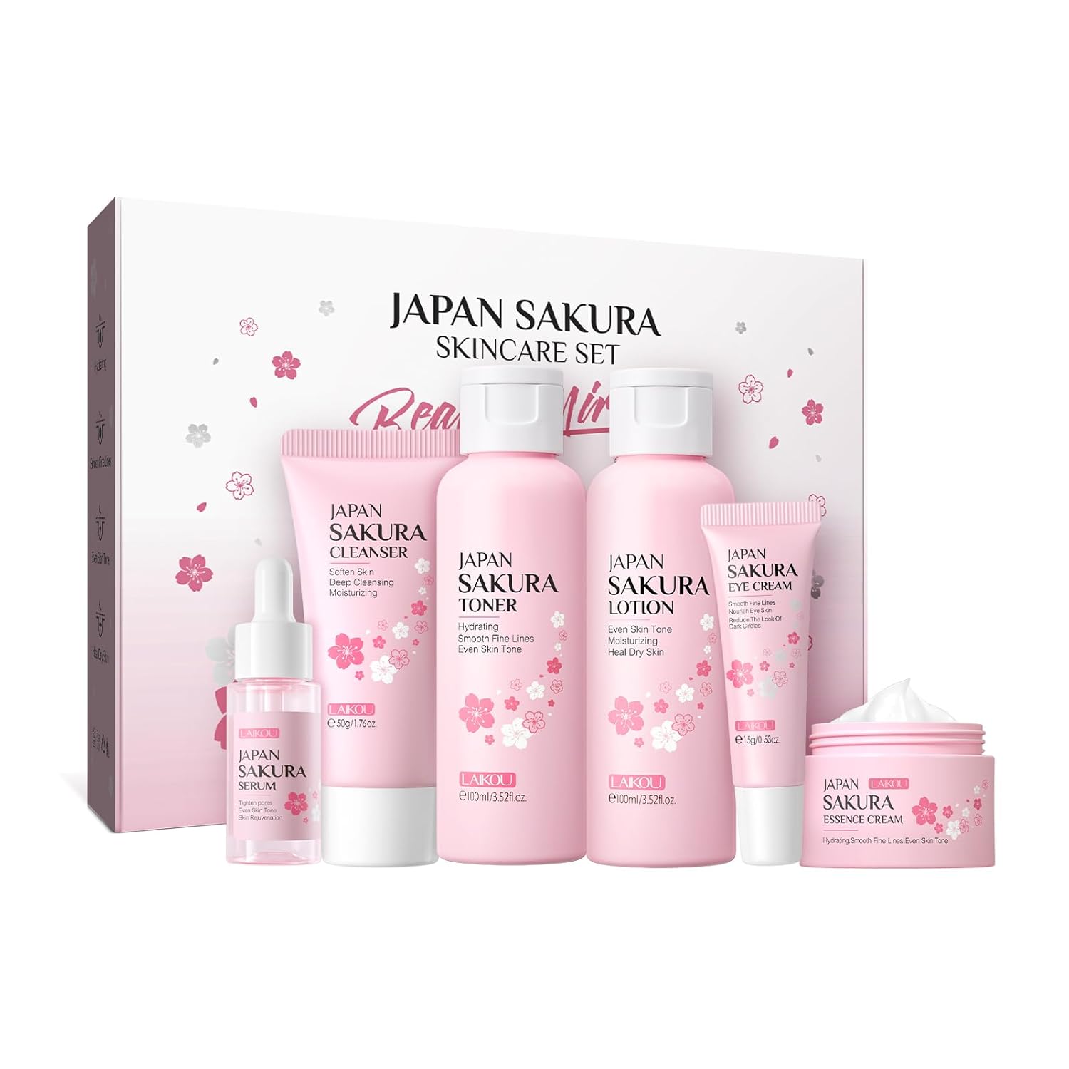 Skin Care Set JAPAN SAKURA Women Beauty Gift Sets Skin Care Kit with Cleanser, Toner, Lotion, Serum, Eye Cream, Face Cream Travel Kit for Women Teen Girls Mom Daughter TSA-friendly Sizes 6pcs