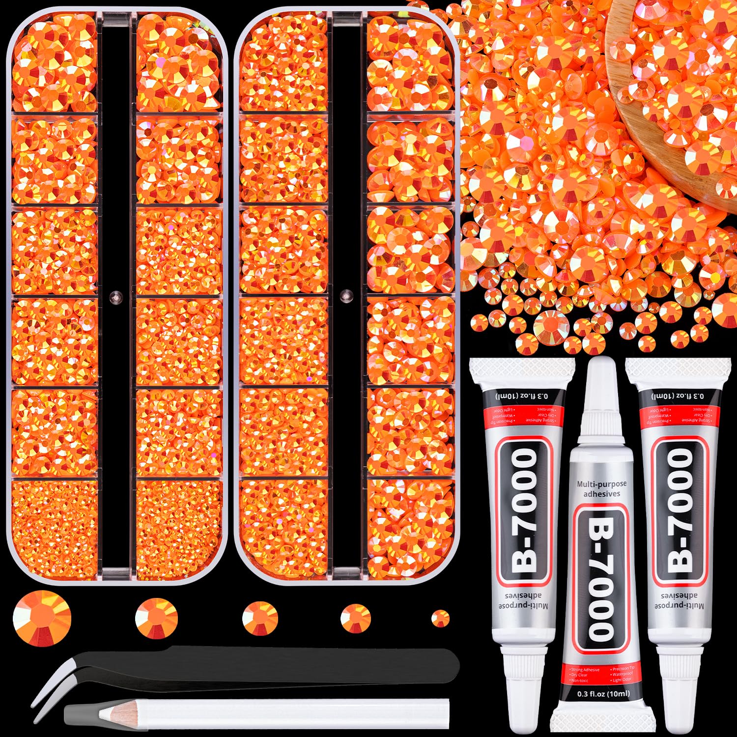 Resin Jelly Rhinestones for Crafting with B7000 Jewelry Glue, 2 Boxes Orange AB Flatback Crystals with 3Pcs 10ml Glue, Bedazzling Non Hotfix Gems for DIY Tumblers Clothing Shoes Manicure