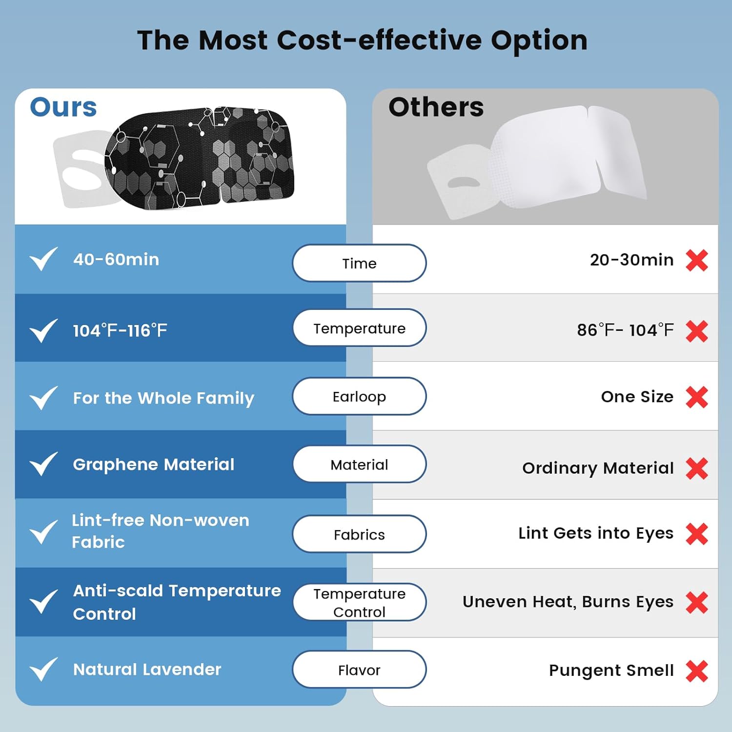 - Long-lasting Warmth for 40-60 Mins: Our dry eye mask utilizes advanced graphene material, ensuring consistent heating for 40-60 minutes. Compared to other steam eye masks, heated eye mask maintains a more durable and constant temperature. Graphene's unique high-temperature control evenly heats, preventing any risk of burning your eyes.