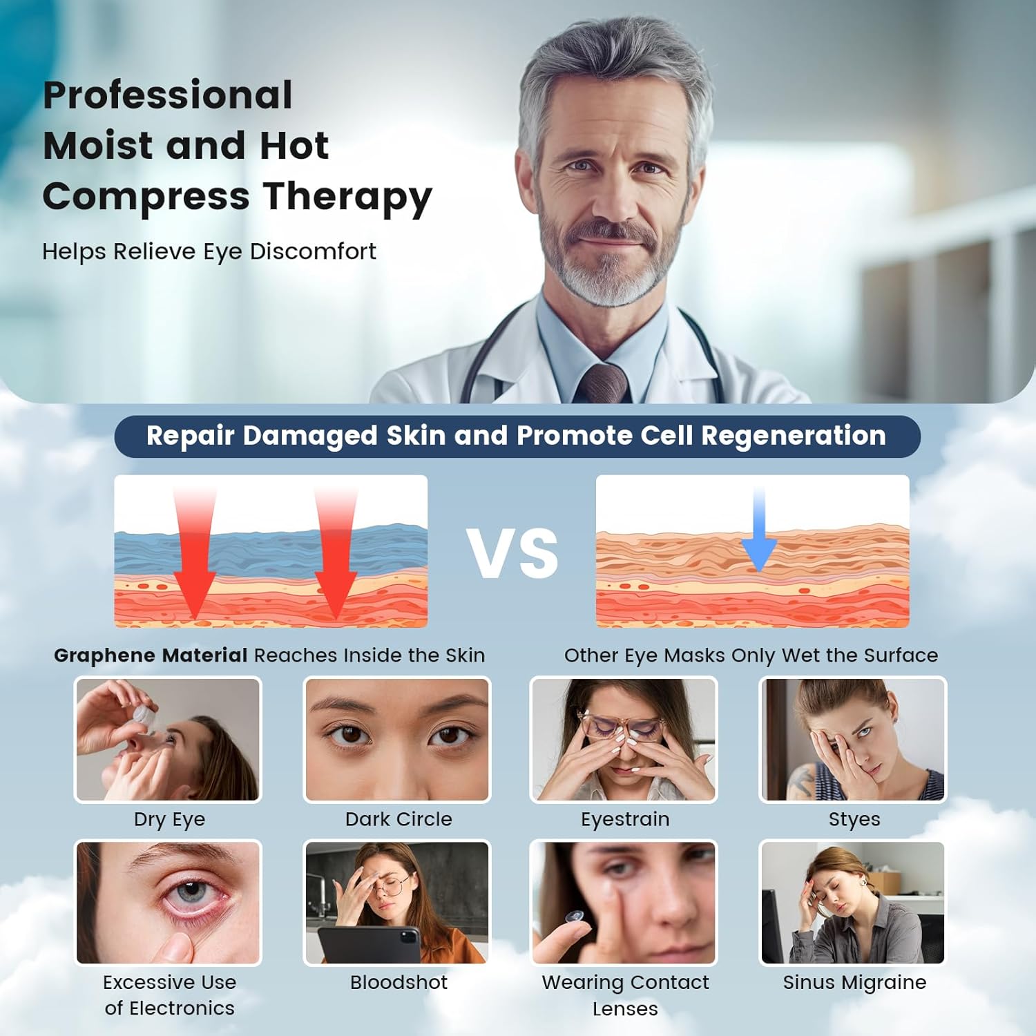 - The Best Solution for Dry Eyes: The graphene material of the steam eye mask releases far-infrared microwaves during warm compress, which penetrates deep into the skin, relieving dry eyes and fatigue, moisturizing the eyes, reducing eye puffiness and dark circles. Natural lavender extract helps soothe nerves and improve sleep quality.