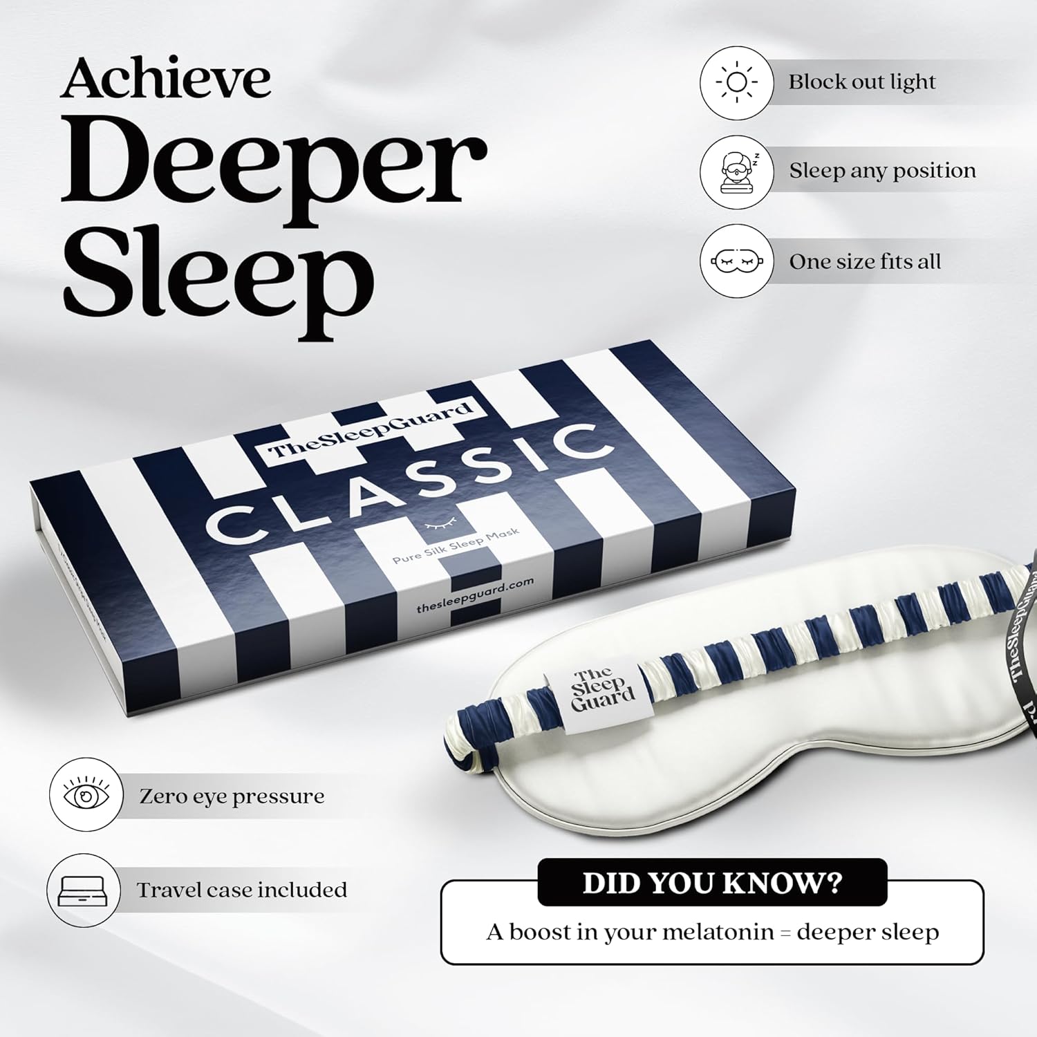 - 🔆 BLOCK OUT LIGHT - Achieve a deeper sleep with our pure silk sleep mask. An eye cover will help you get a better night’s sleep by falling asleep faster and staying asleep longer thanks to a boost in melatonin production.