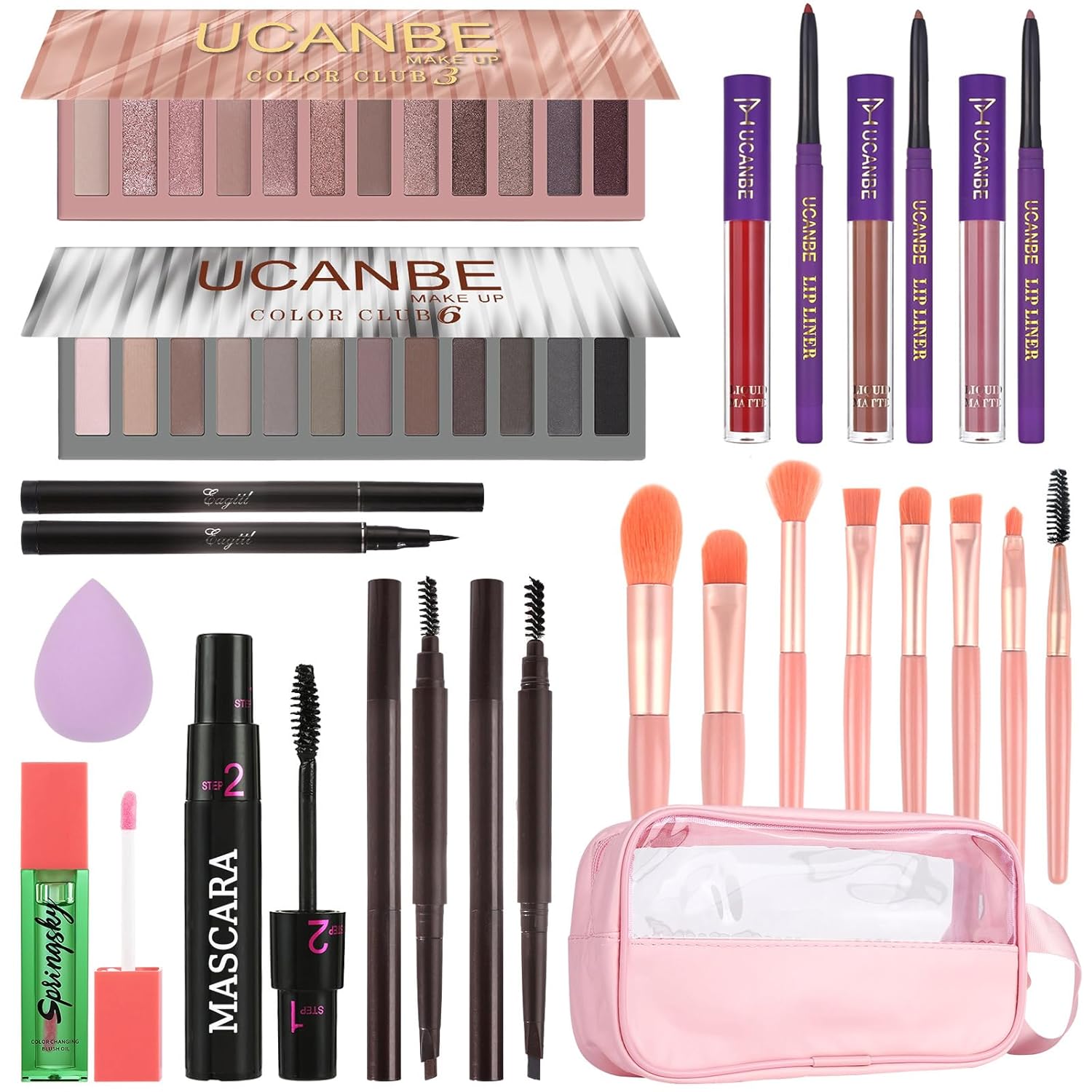 - UCANBE Women Makeup Gift Kit features a box consisting of an assortment of beauty products, including 2 nude eyeshadow pallet, 3 Matte Lipliner, 3 Matte Liquid Lipstick, 1 Color Changing Blush Oil,, 1 Liquid Eyeliner, 2 Grey and Brown Eyebrow Pen, 1 Mascara, 1 Eye Makeup Brush Kit, 1 Pink Makeup Bag, 1 Makeup Sponge.