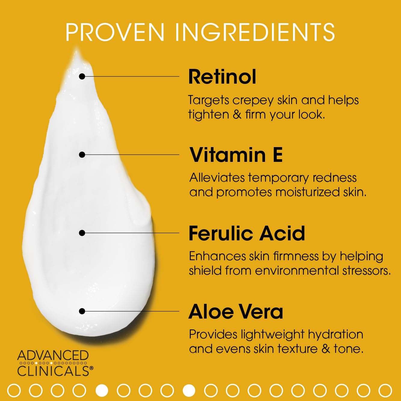- HYDRATING & NOURISHING – Advanced Clinicals Retinol Cream is infused with Aloe Vera, Chamomile, Glycerin, & Green Tea, which all work together to effectively firm skin + reduce the appearance of sun damaged skin, wrinkles, fine lines, & crepey skin. Aloe Vera defends against visible redness & irritation. Green Tea + Chamomile guards against environmental damage & reduces puffiness. Combination of ingredients make this Retinol Body Cream non-irritating unlike many other retinol products.