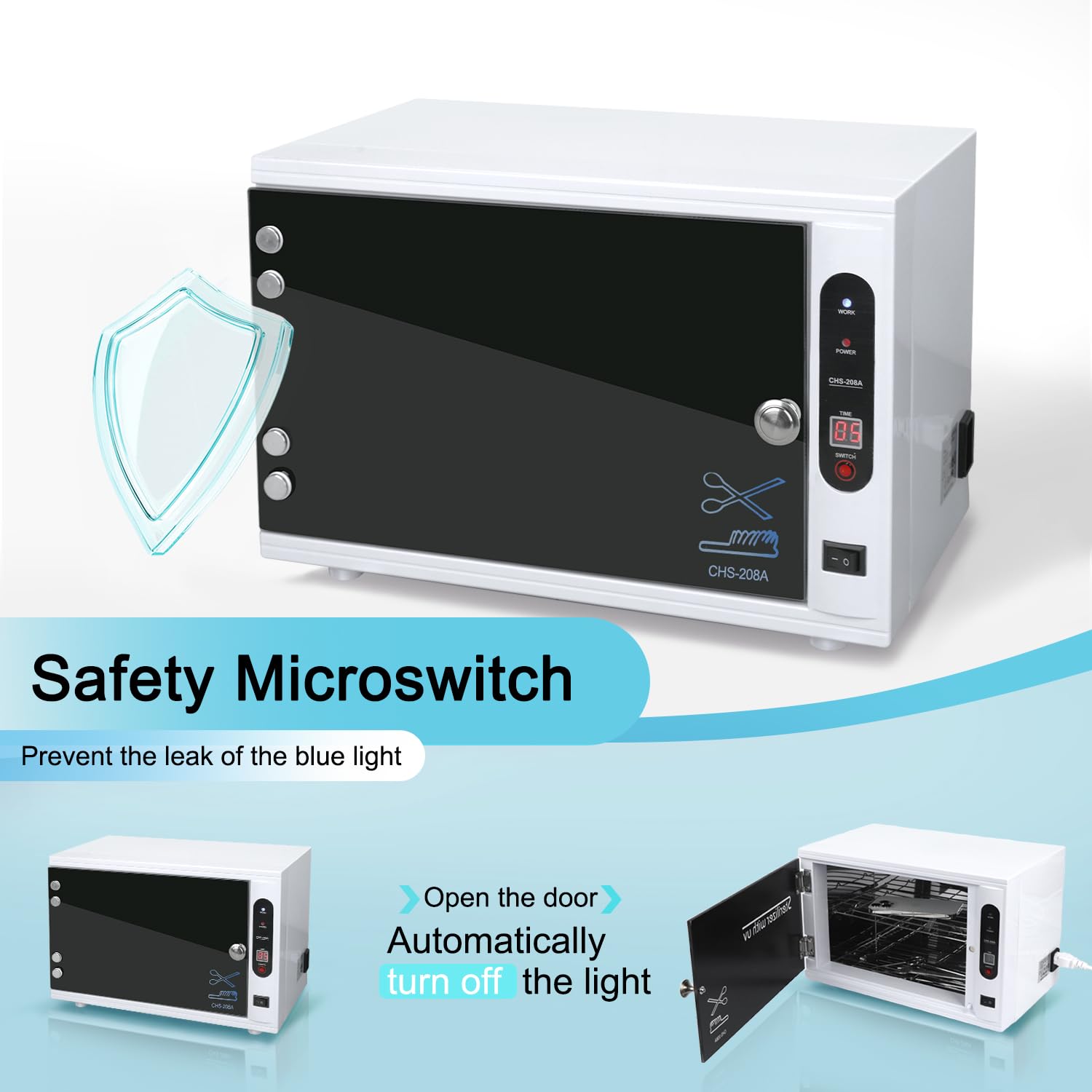 - ✅ Effective Cleaner Cabinet- Our oven pro uses light, not heat, so it is safe for all objects. To keep your secure and healthy, our 12L Large cleaning box operates at a 254nm wavelength for 360° cleaning of your beauty tool, spa tool or hair tools. Nail salon tools Cleaning Equipment interior adopts high-quality stainless steel structure, durable, no rust. Customize the cleaning time of 20-60 minutes according to your needs.