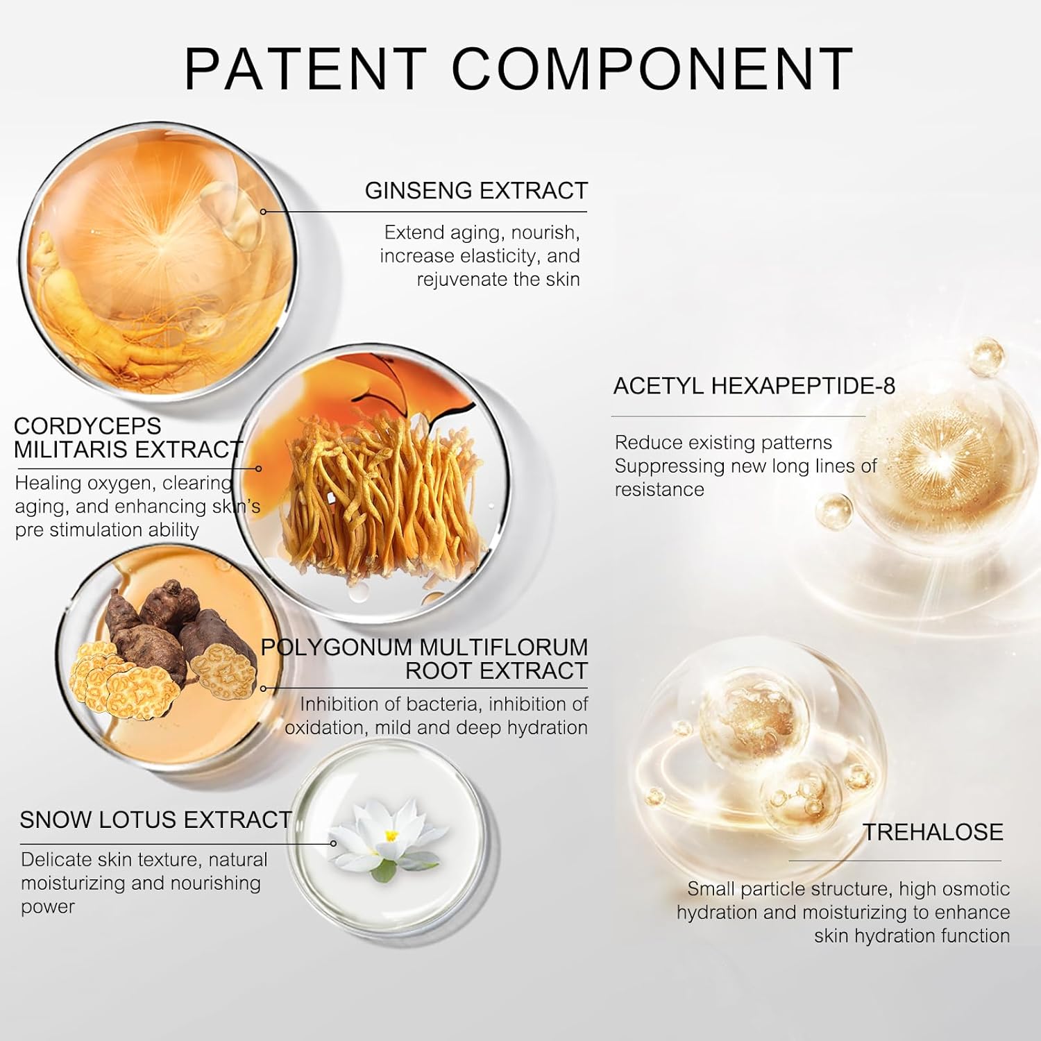 - 【Panax Ginseng】: Cold brewing and refining to extract ginseng essence, smooth wrinkles and fine lines,smooth and translucent skin.