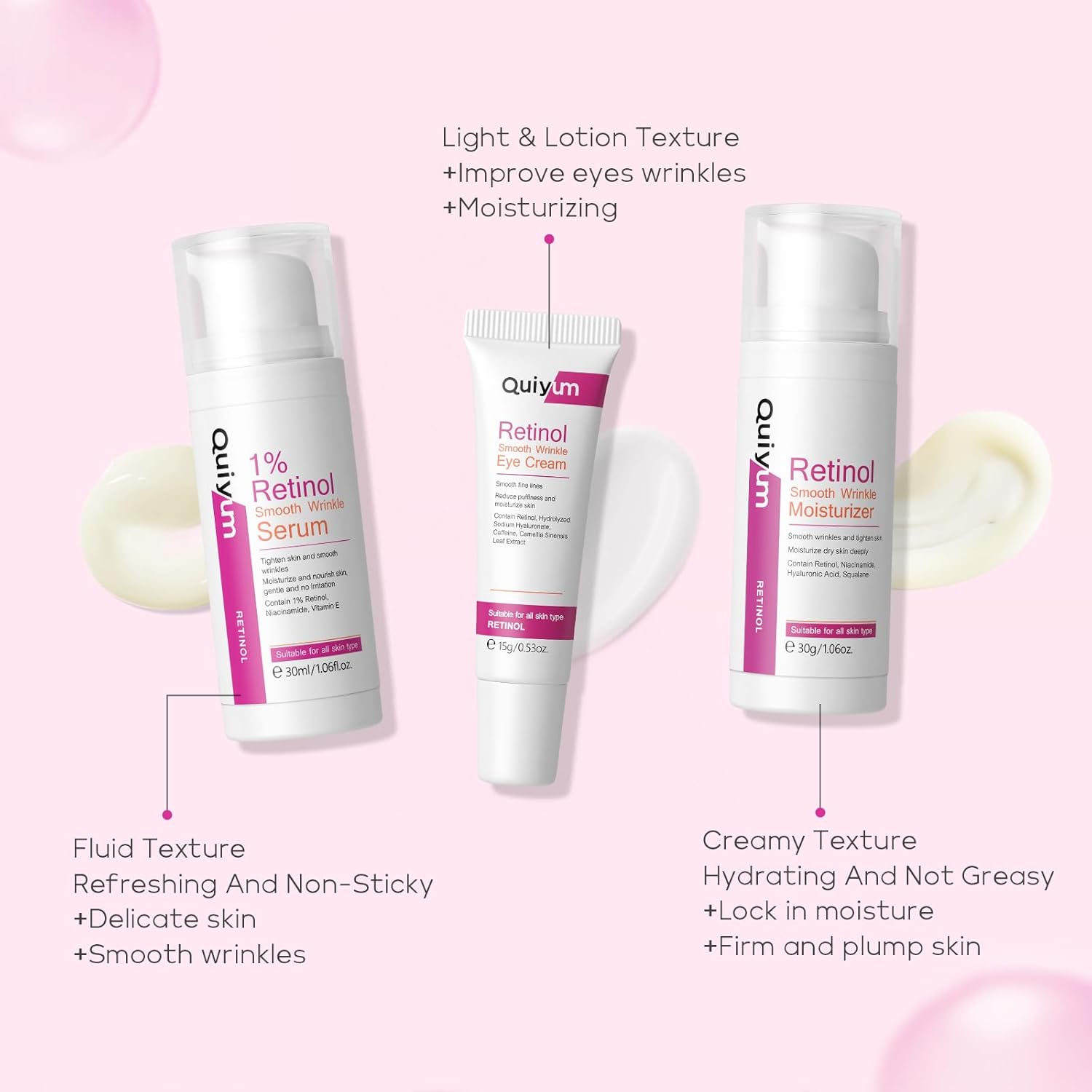 - 【Advanced Anti Aging Formula】Retinol, renowned for its powerful anti aging properties, reduces fine lines, wrinkles, and imperfections while promoting a youthful, radiant complexion. Quiyum Retinol Skin Care Set features a gentle, non-irritating formula suitable for all skin types, providing a tailored solution whether preventing signs of aging or addressing existing concerns.