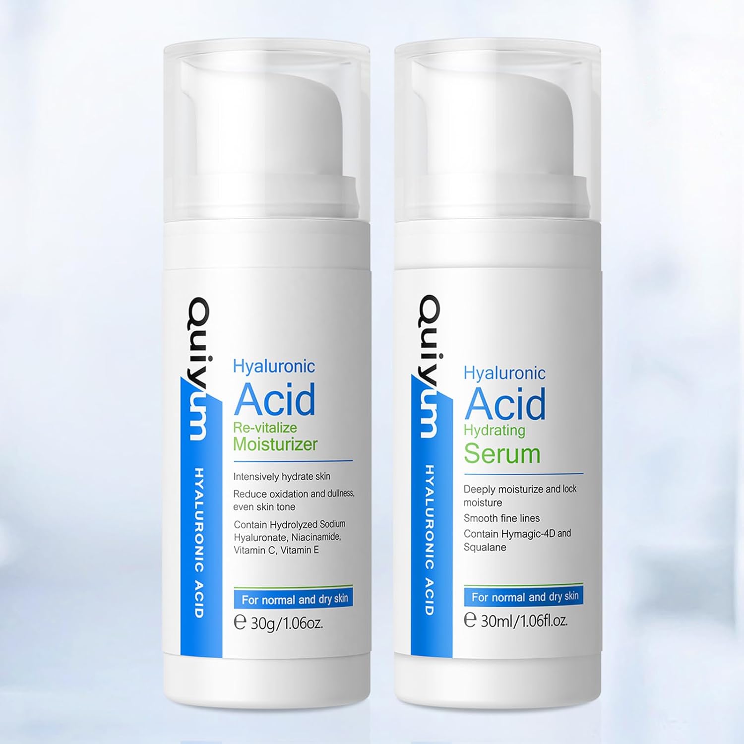 - 【Hydrating Skin Care Set】Pamper your skin with QUIYUM Skin Care Set and indulge in a perfect hydration regimen - 4D Hyaluronic Acid Face Serum and Re-vitalize Moisturizer. Experience the power of intense hydration and achieve a radiant, firm, and plump complexion with Hydrating Skin Care Set. Face Care Set for Women deeply moisturizes and hydrates the skin, reduces oxidation, evens out skin tone, smooths fine lines, and enhances skin radiance.