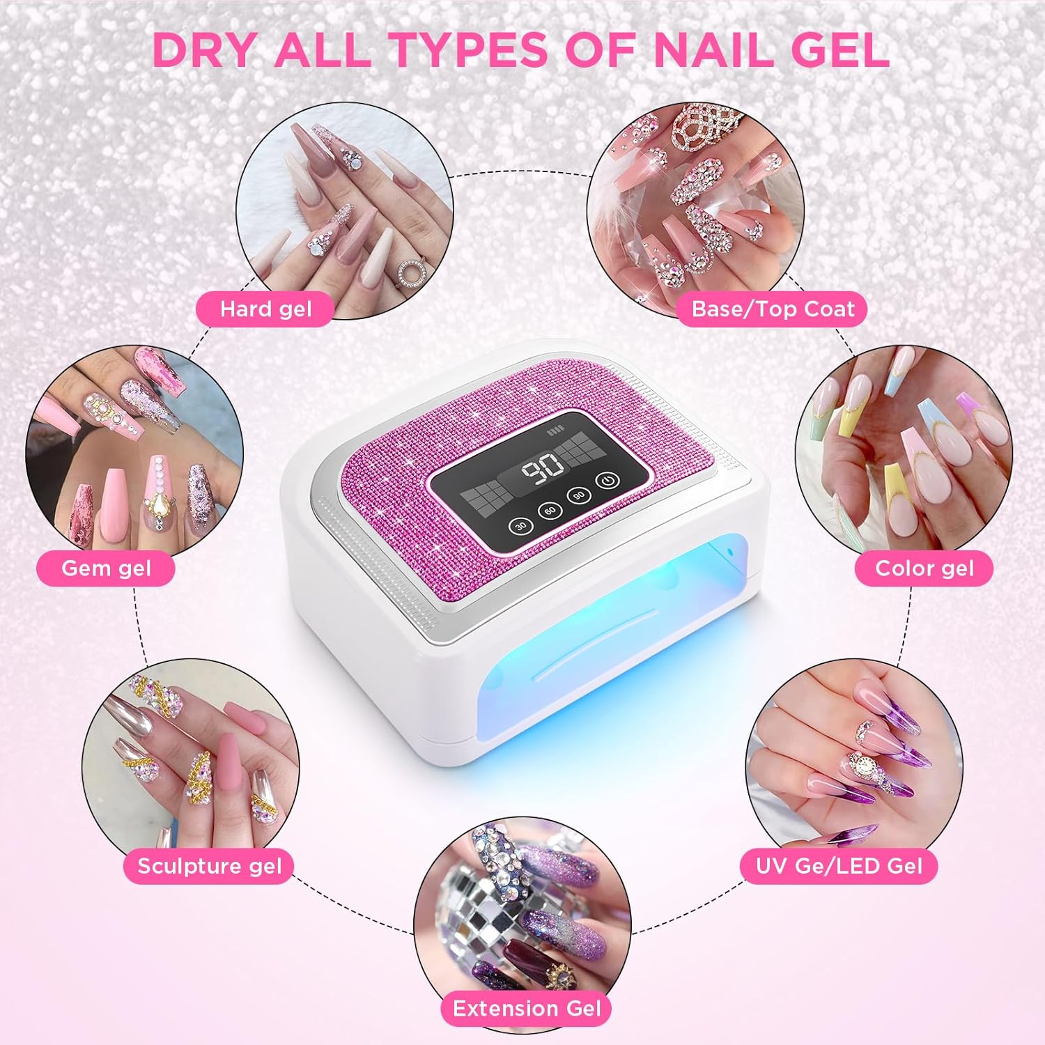 Cordless Nail Lamp, Rechargeable UV Nail Lamp for Gel Nails, LED Nail Lamp with 4 Timer Modes, Gel Nail Light Decorate with Sparkling Nail Rhinestones Diamond (Sparkly Rose Red Diamond)