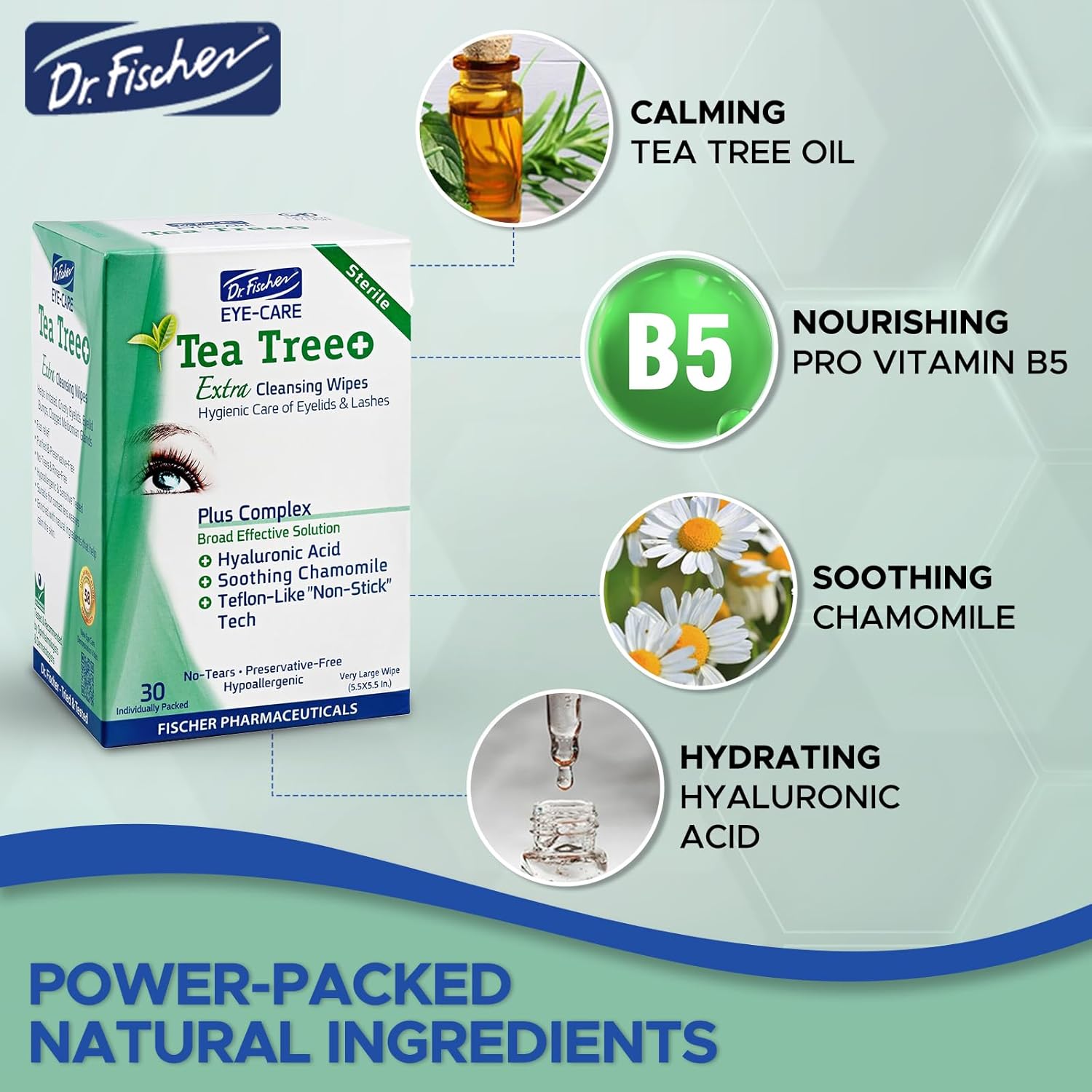 Dr. Fischer Tea Tree Oil Eye Wipes - Eyelid Wipes for Sensitive Eyes with Hyaluronic Acid and Chamomile, Makeup Remover, Daily Cleanser (30 wipes)